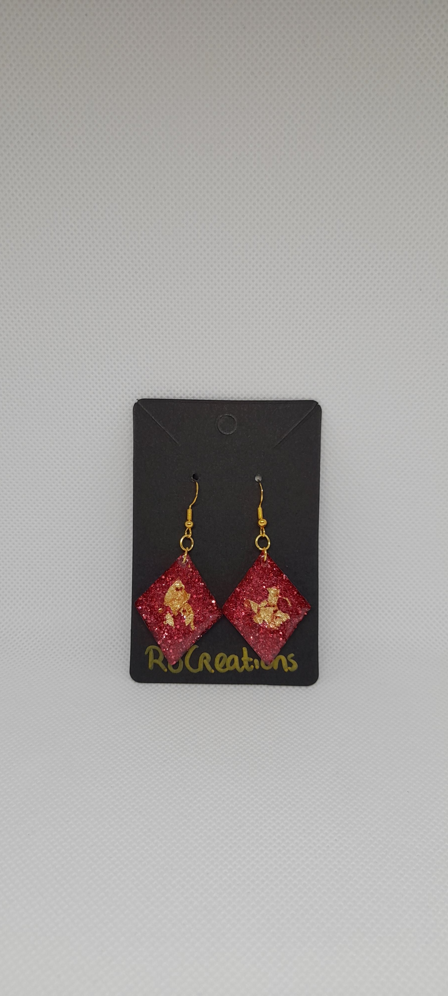Oorbellen van epoxy met roze glitter en gouden detail.