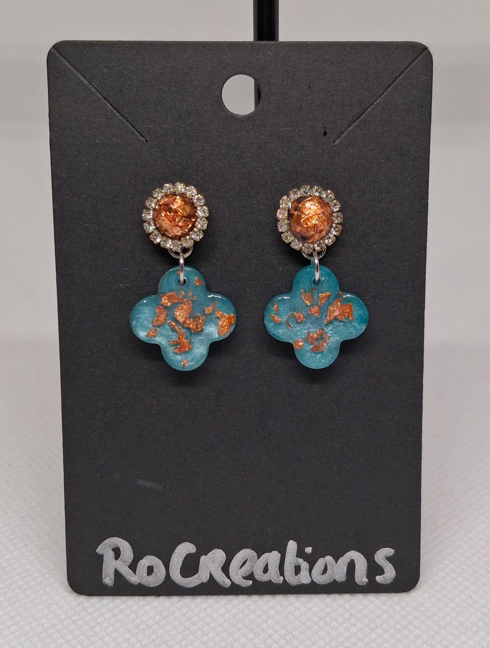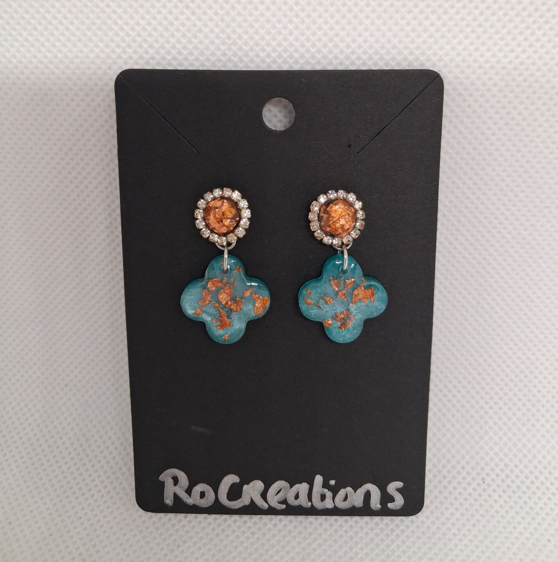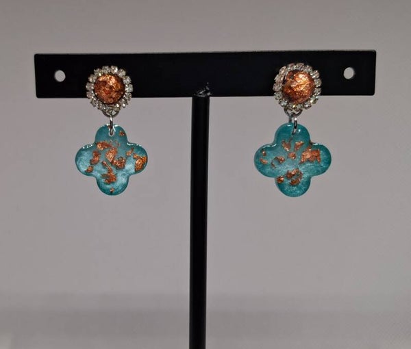 Deze elegante oorbellen hebben een kleine ronde knop van epoxy met rosé kleurig bladgoud en een cirkel van strasssteentjes eromheen voor een subtiele glans. De knop is verbonden met een klavervormige hanger van epoxy in turquoise, versierd met rosé bladgoud details. Het ontwerp combineert verfijning en glamour, perfect voor een chique uitstraling.