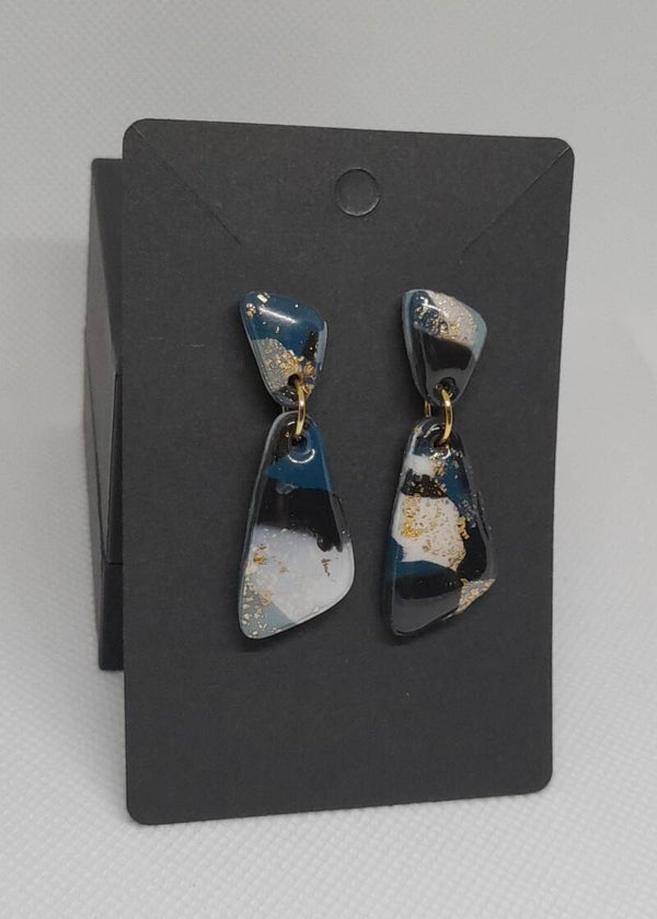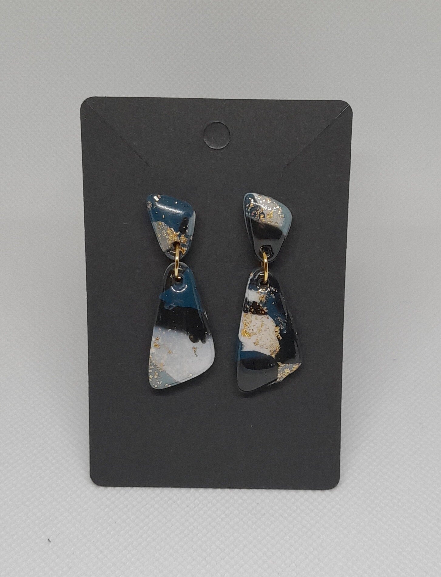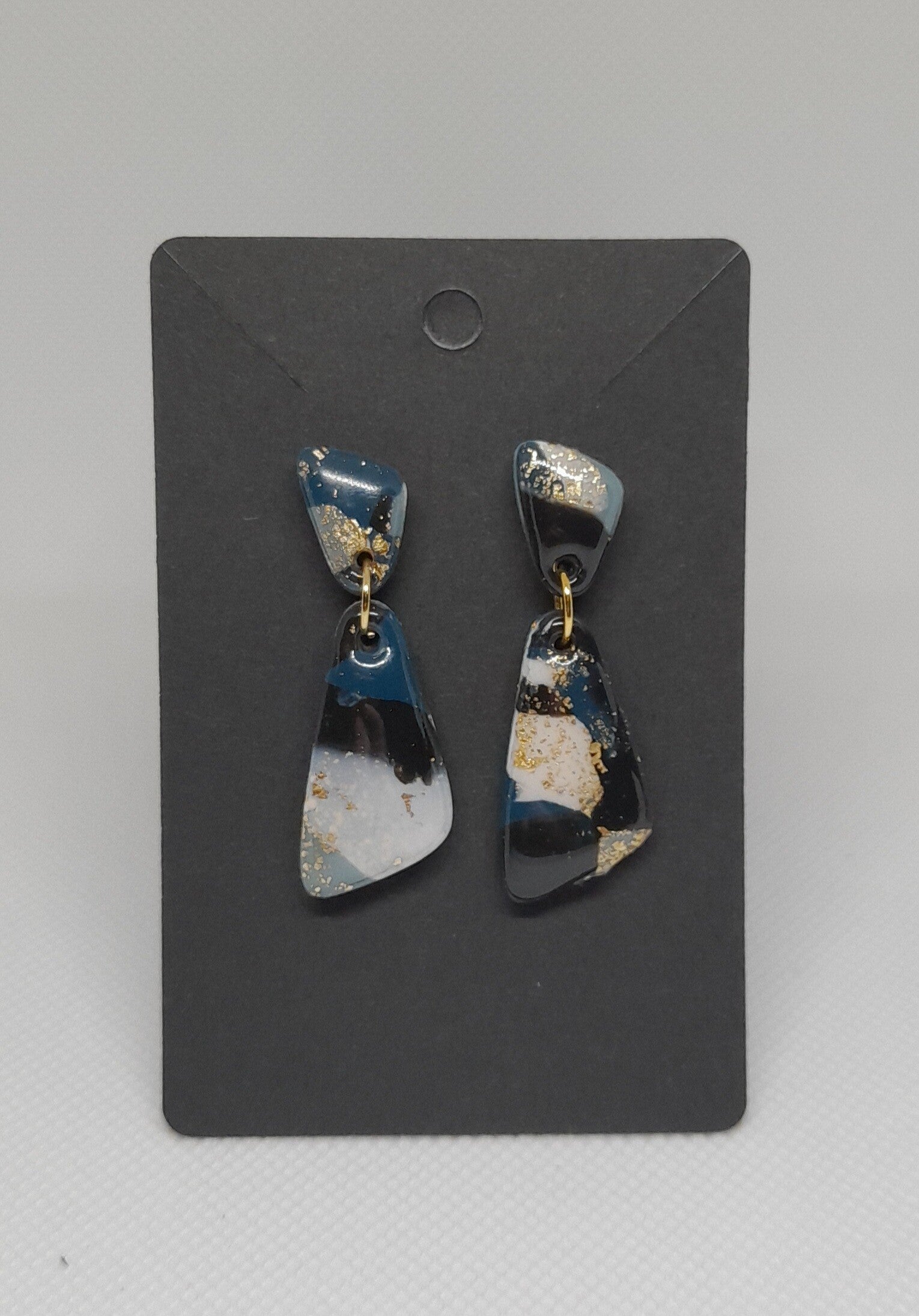 Oorbellen van polymeerklei met petrol kleuren, wit zwart en goudkleur. De Oorbellen hebben een mooie glans door de epoxy laag. Ze zijn lekker asymmetrisch, hebben een elegante en originele look.