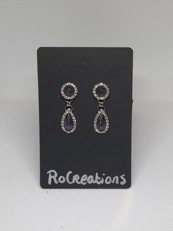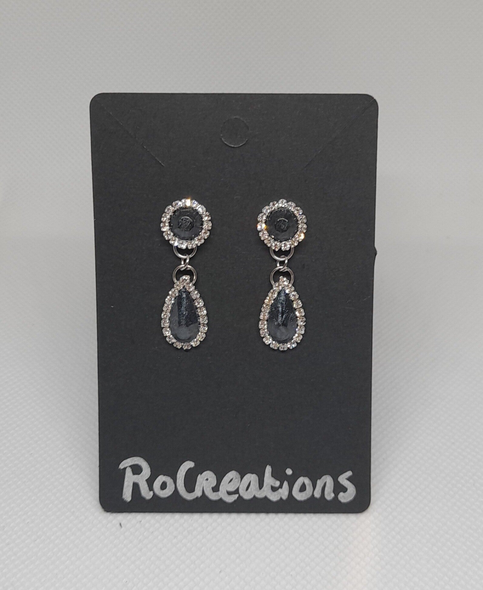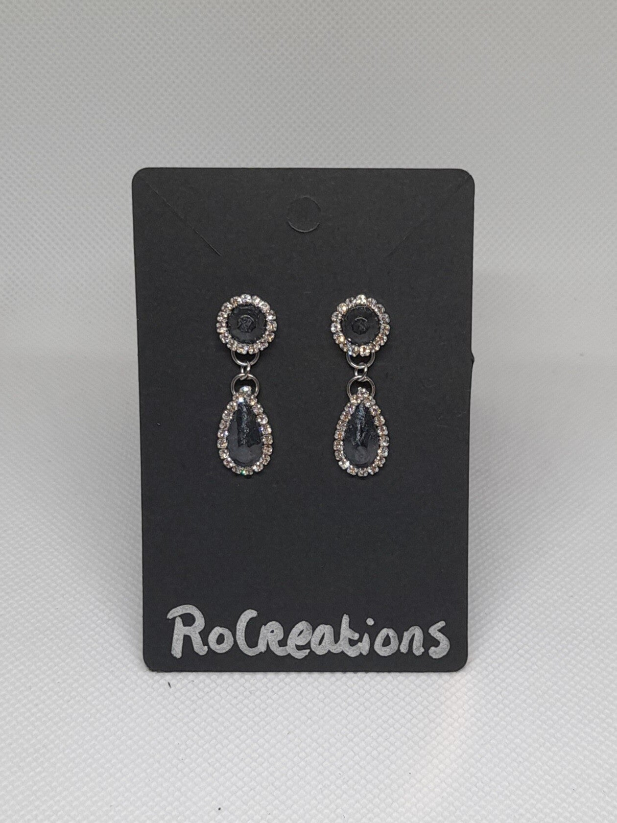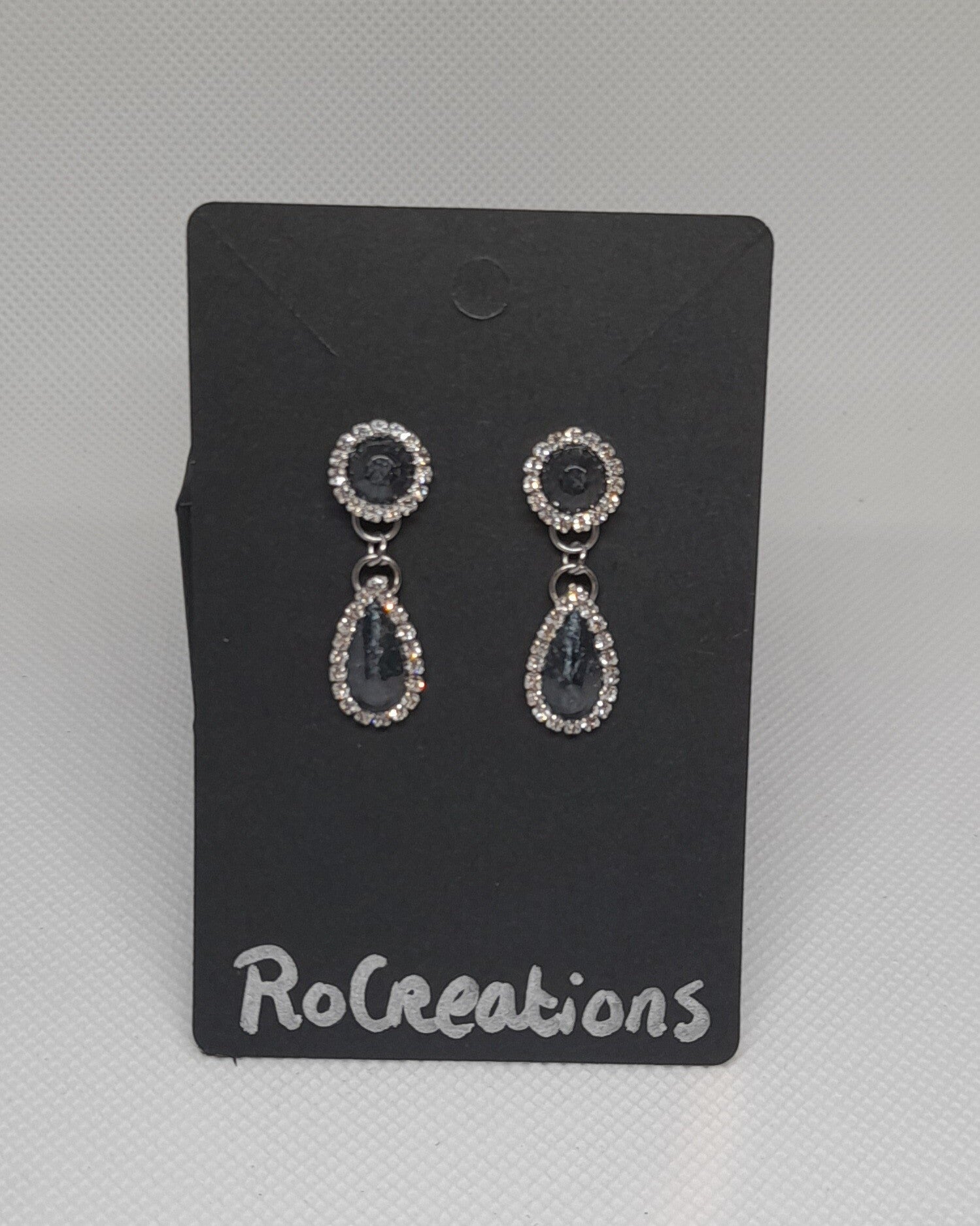 Deze oorbellen hebben een zwarte, ronde knop met een druppelvormige hanger, versierd met strasssteentjes, voor een elegante uitstraling.