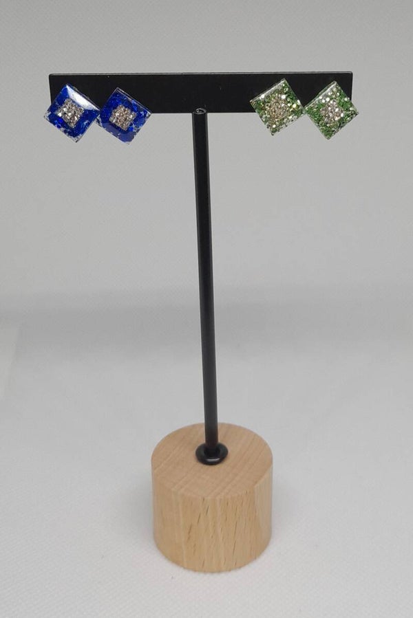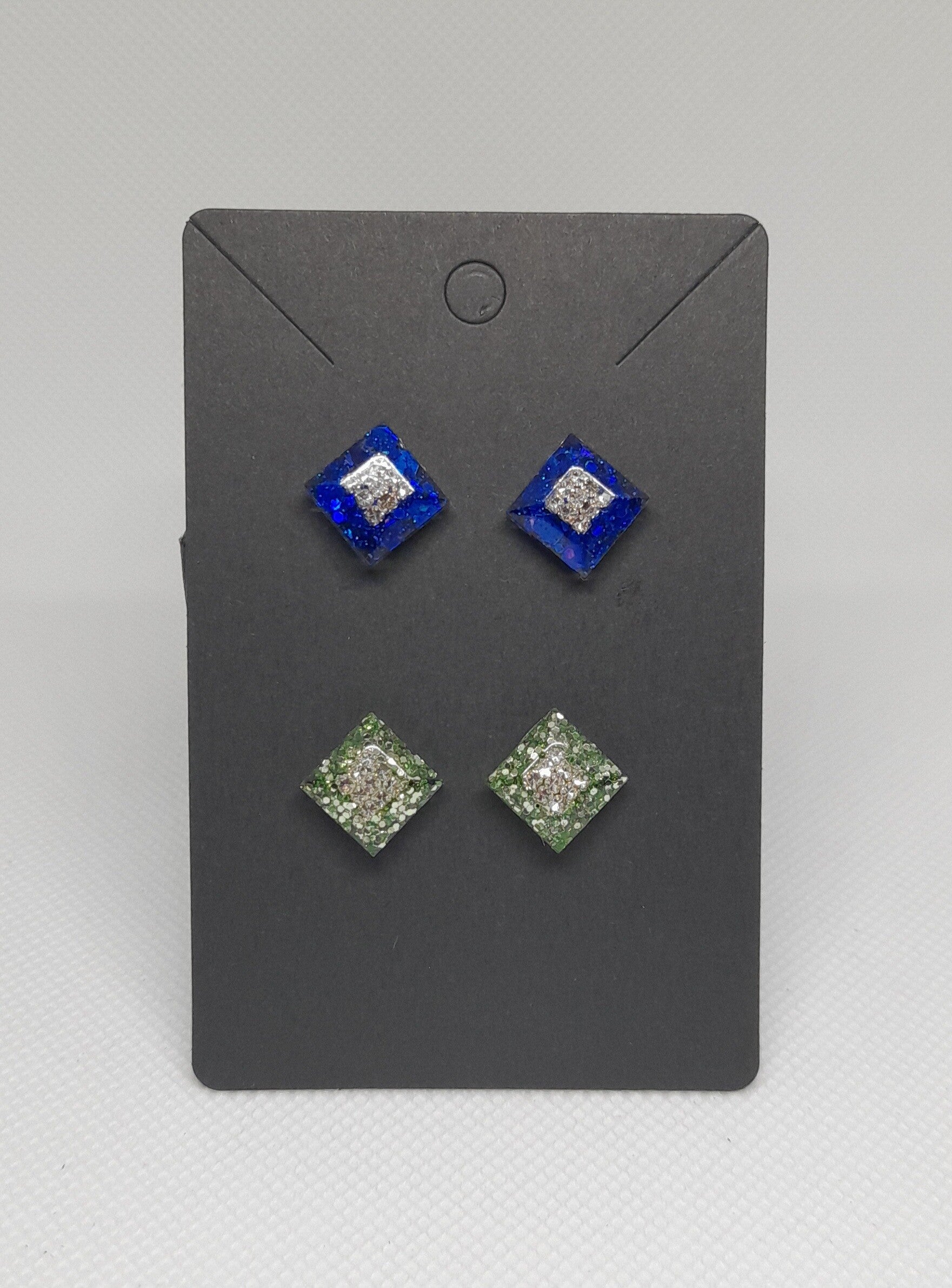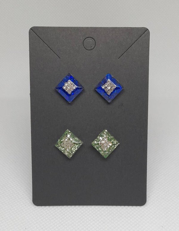 Deze set ruitvormige oorbellen in groen en blauw hebben strasssteentjes in het midden die mooi schitteren. Ze zijn een stijlvolle en kleurrijke toevoeging aan je look.