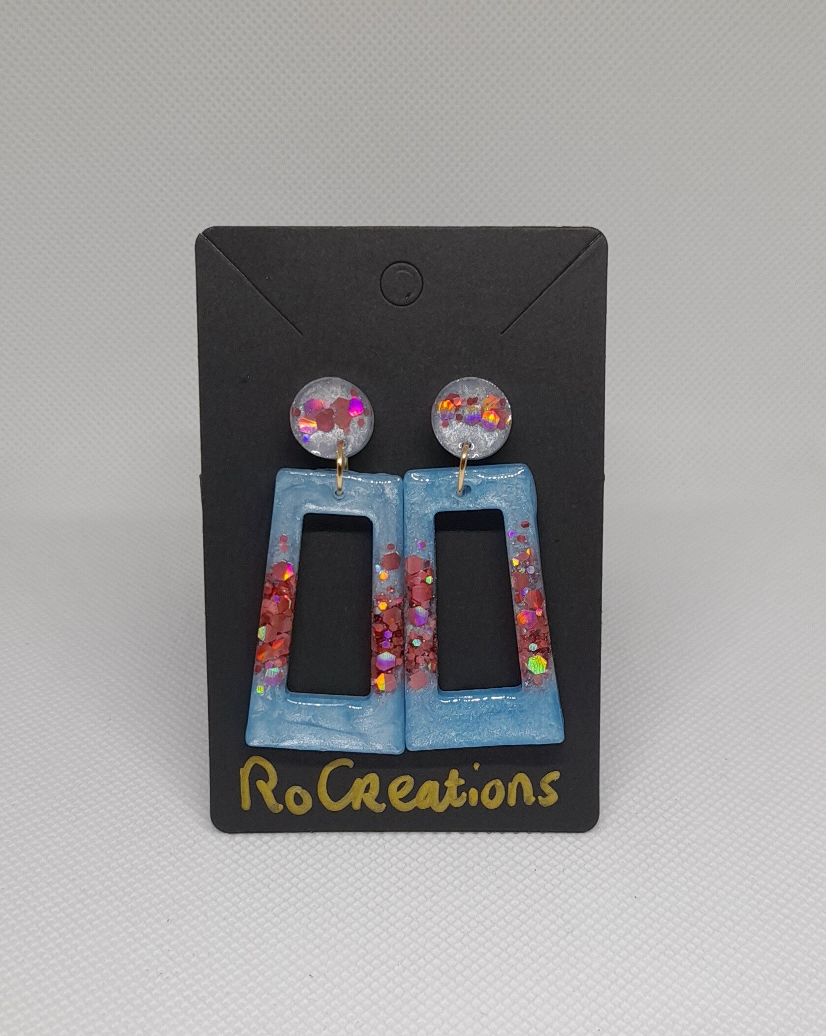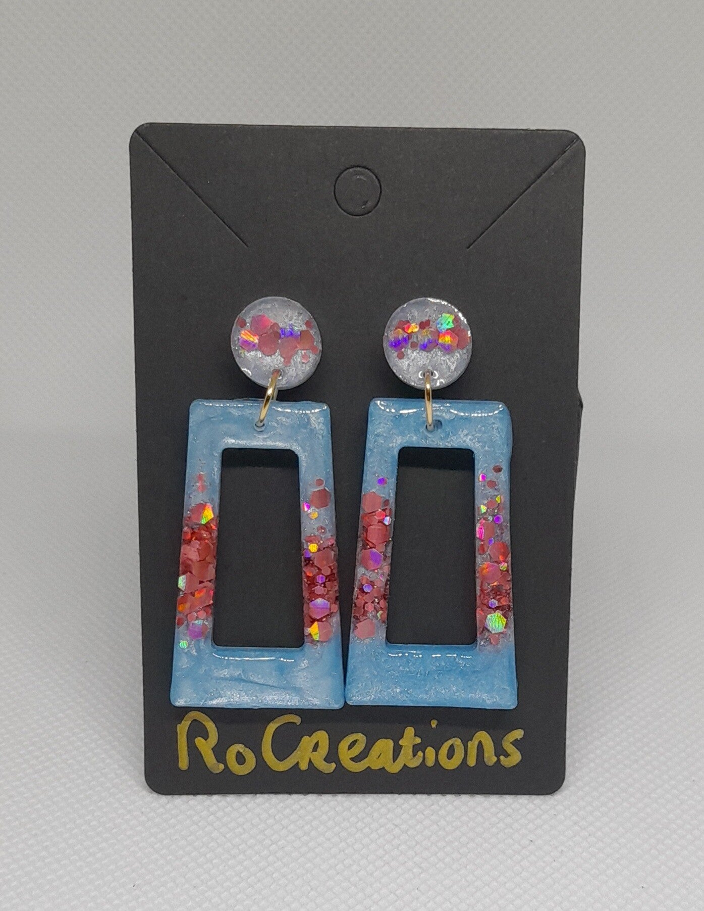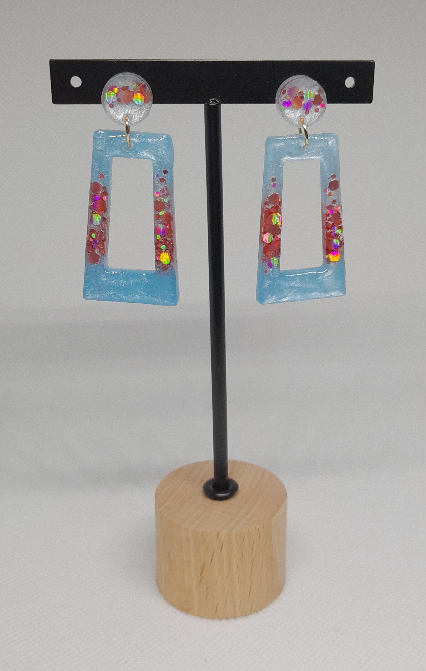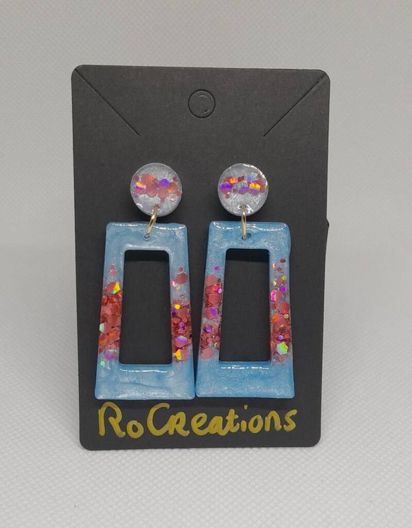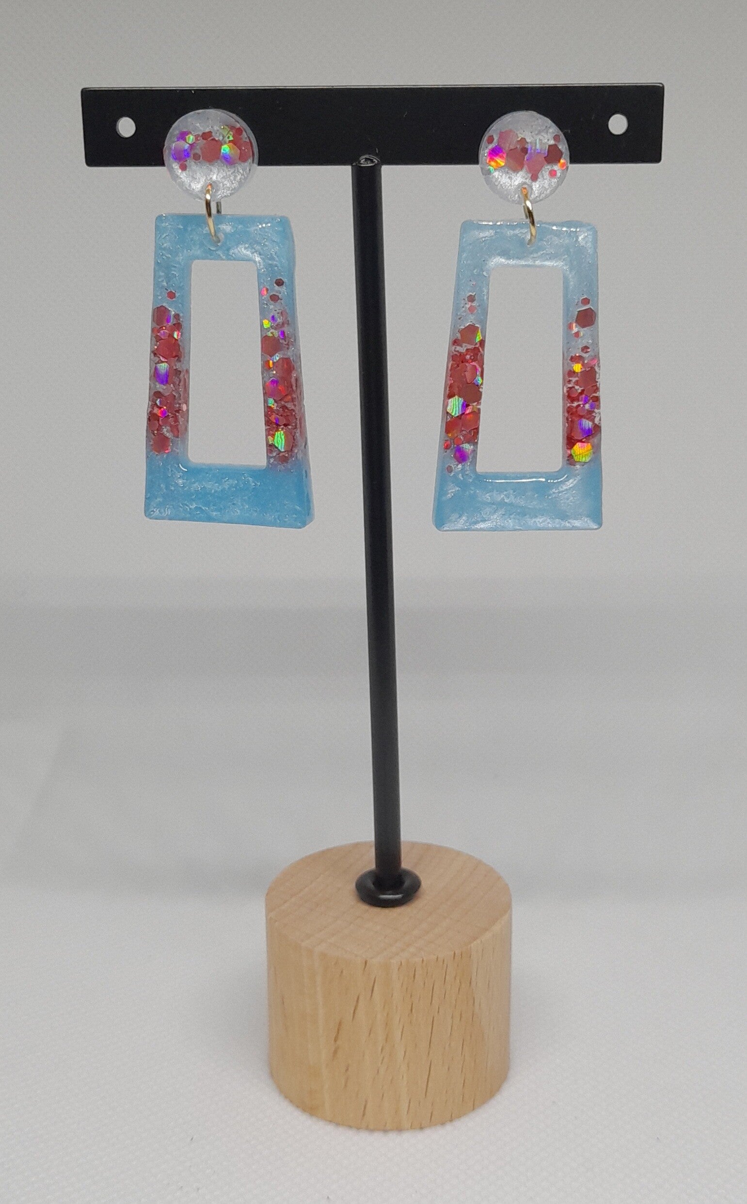 Deze oorbellen hebben een stijlvolle ronde knop in combinatie met een rechthoekige hanger. De lichte blauwe kleur wordt gecombineerd met roze/rode glitter, waardoor ze een speelse en opvallende uitstraling hebben.