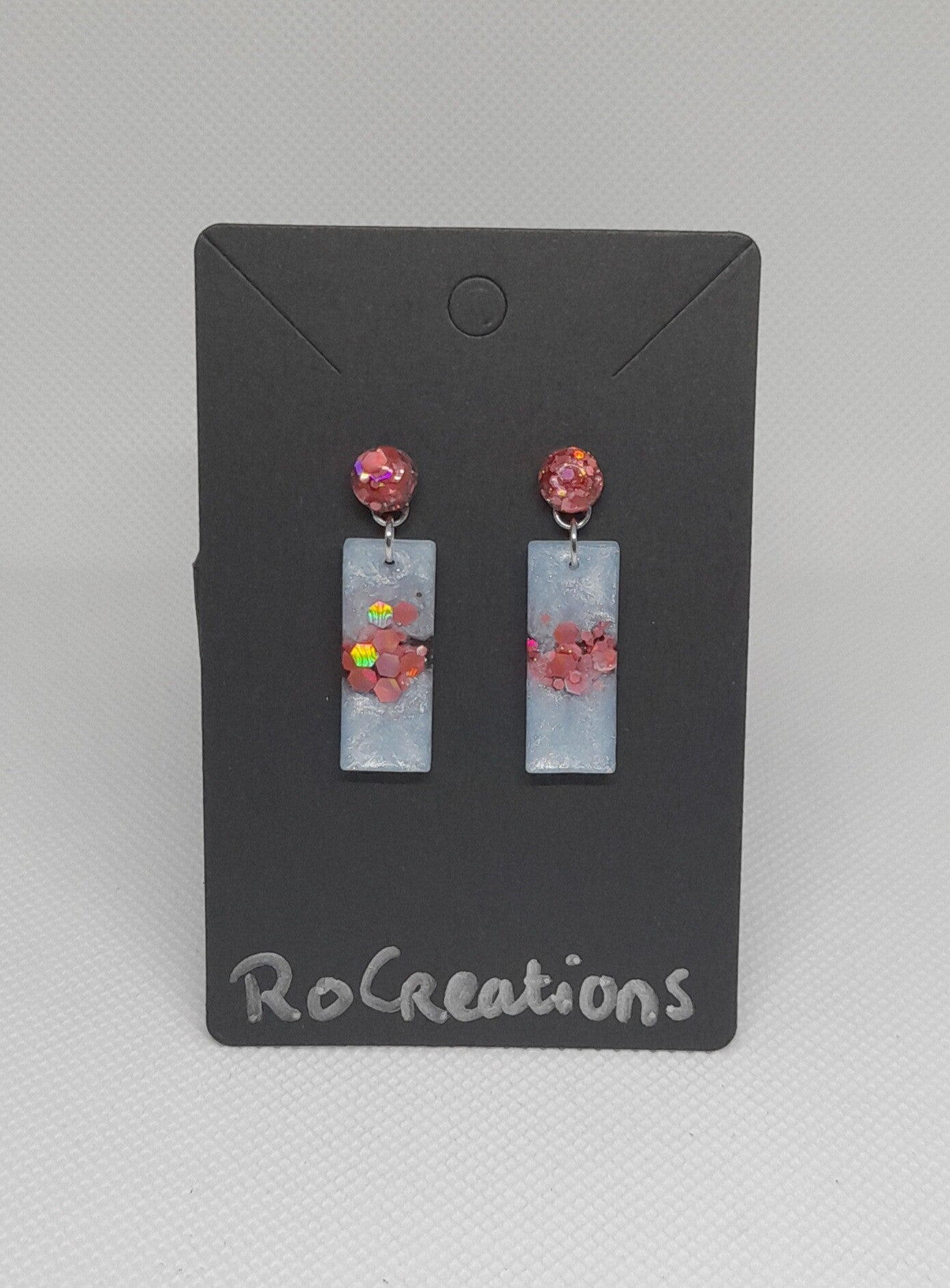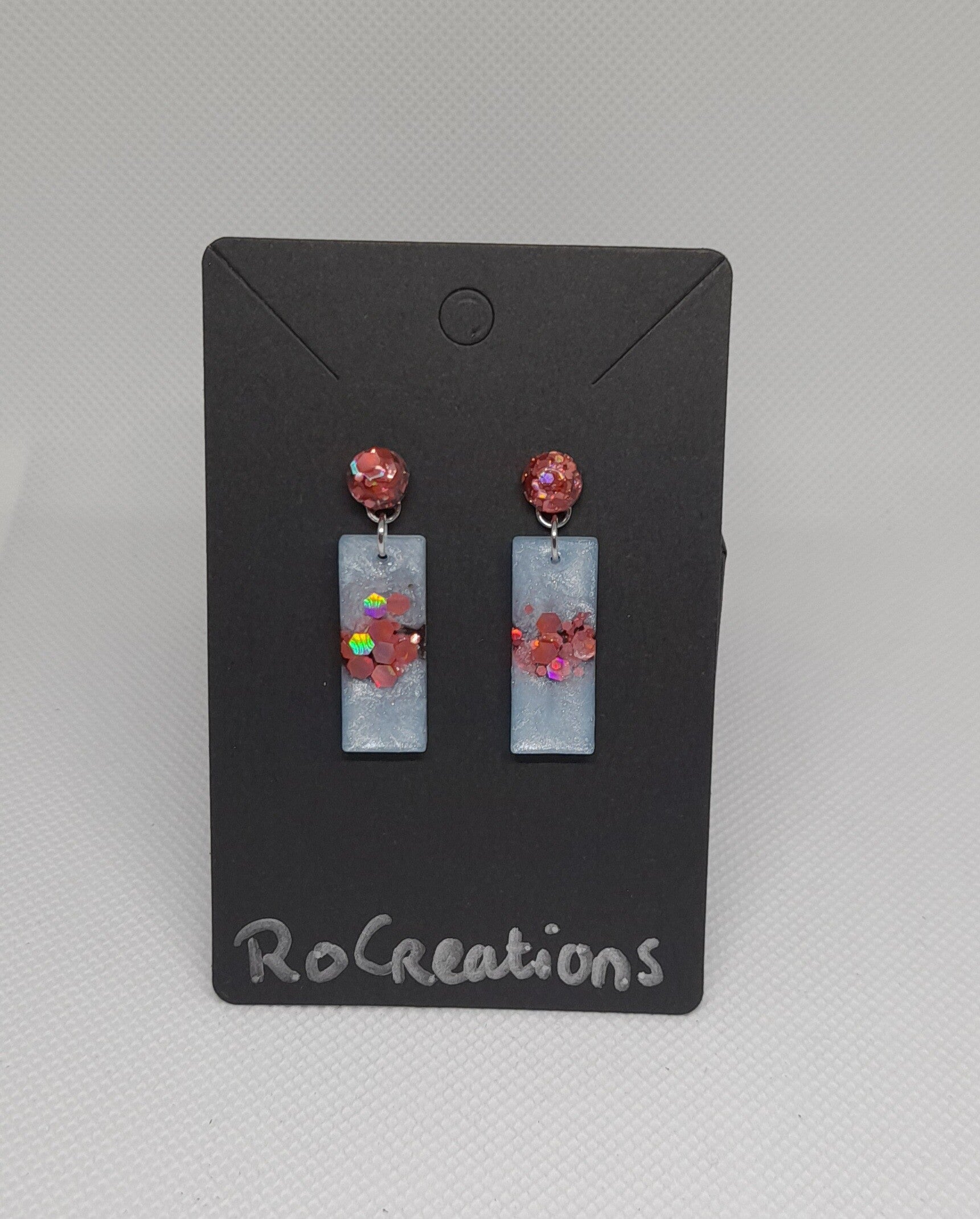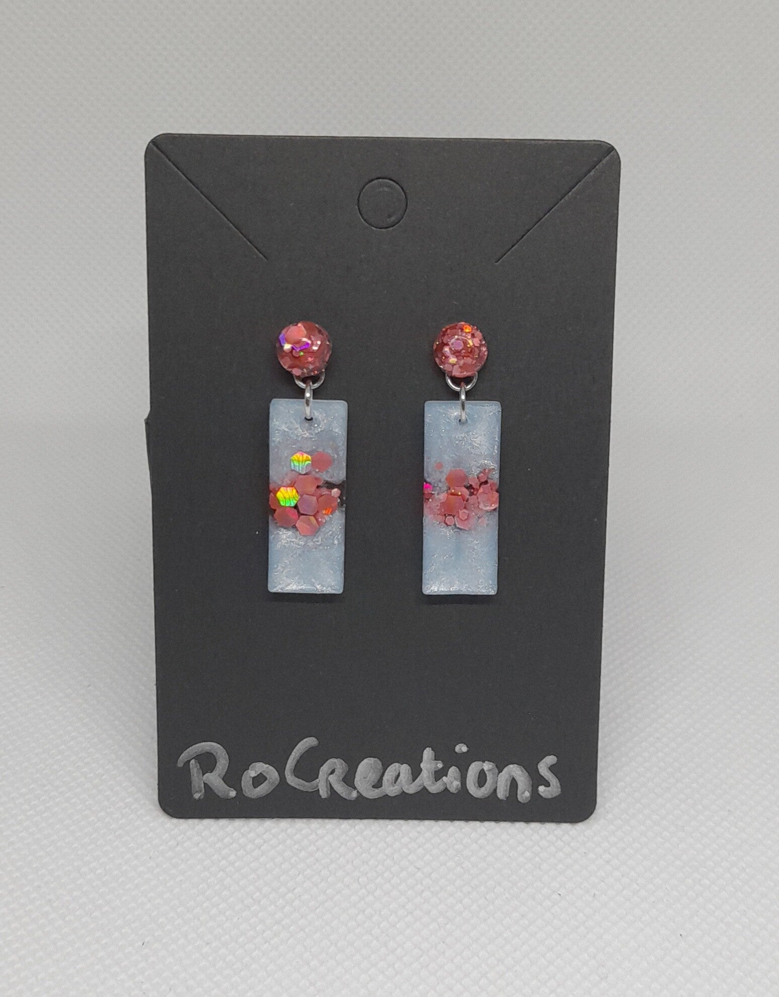 Deze oorbellen hebben een kleine ronde knop in roze/rood glitter, gecombineerd met een rechthoekige hanger in lichtblauw met hetzelfde glittereffect.