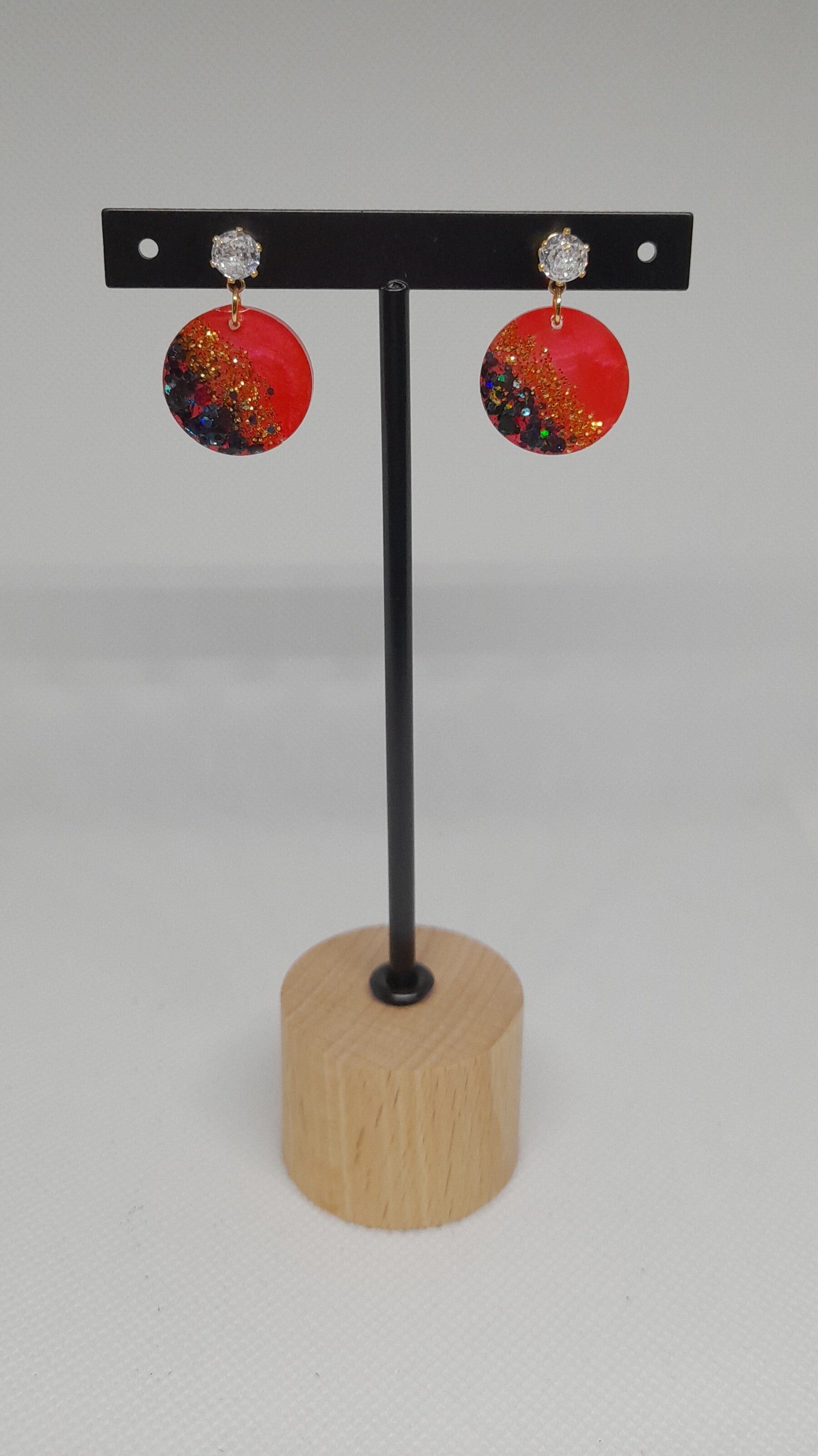 Deze stijlvolle oorbellen hebben een mooie steentje als oorknop, met daaronder een ronde hanger in rood, zwart en goudglitter. Het perfecte accessoire voor een opvallende maar verfijnde look!