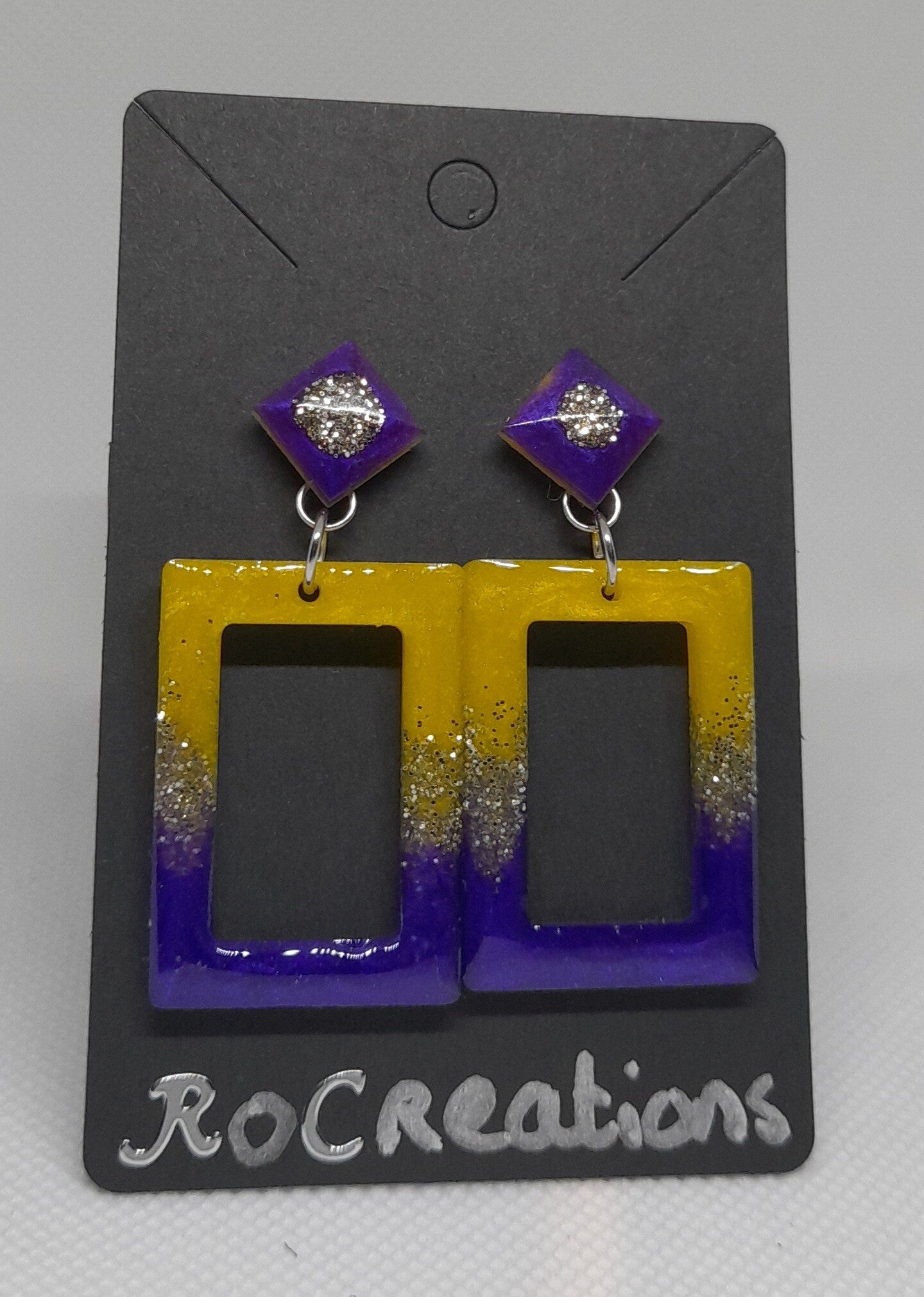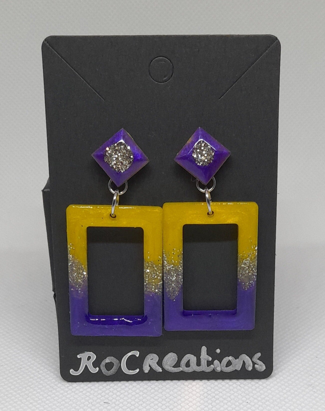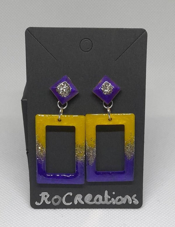 Voeg een speelse, stijlvolle touch toe aan je look met deze unieke handgemaakte oorbellen. De oorbellen bestaan uit een opvallende ruitvormige knop en een rechthoekige hanger, beide vervaardigd uit hoogwaardig epoxyhars. De combinatie van diep paars, zonnig geel en sprankelende zilverglitter zorgt voor een levendige, moderne uitstraling die meteen in het oog springt.