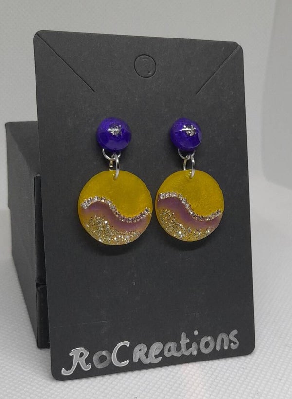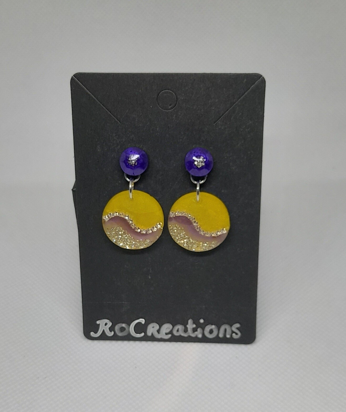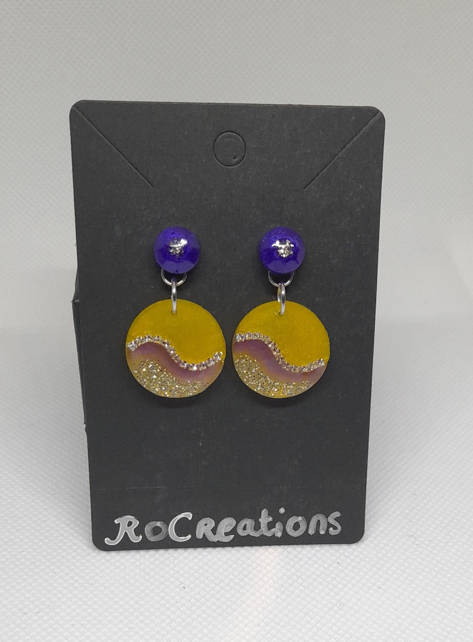 Deze verfijnde oorbellen zijn een perfecte balans tussen speelsheid en elegantie. De kleine, ronde paarse knop met zilverglitter wordt gevolgd door een grotere, ronde hanger in geel, versierd met strasssteentjes, zilverglitter en een vleugje paars. Gemaakt van epoxyhars, zijn de oorbellen licht en comfortabel om te dragen. De roestvrijstalen oorstekers zorgen voor een veilige en langdurige pasvorm.