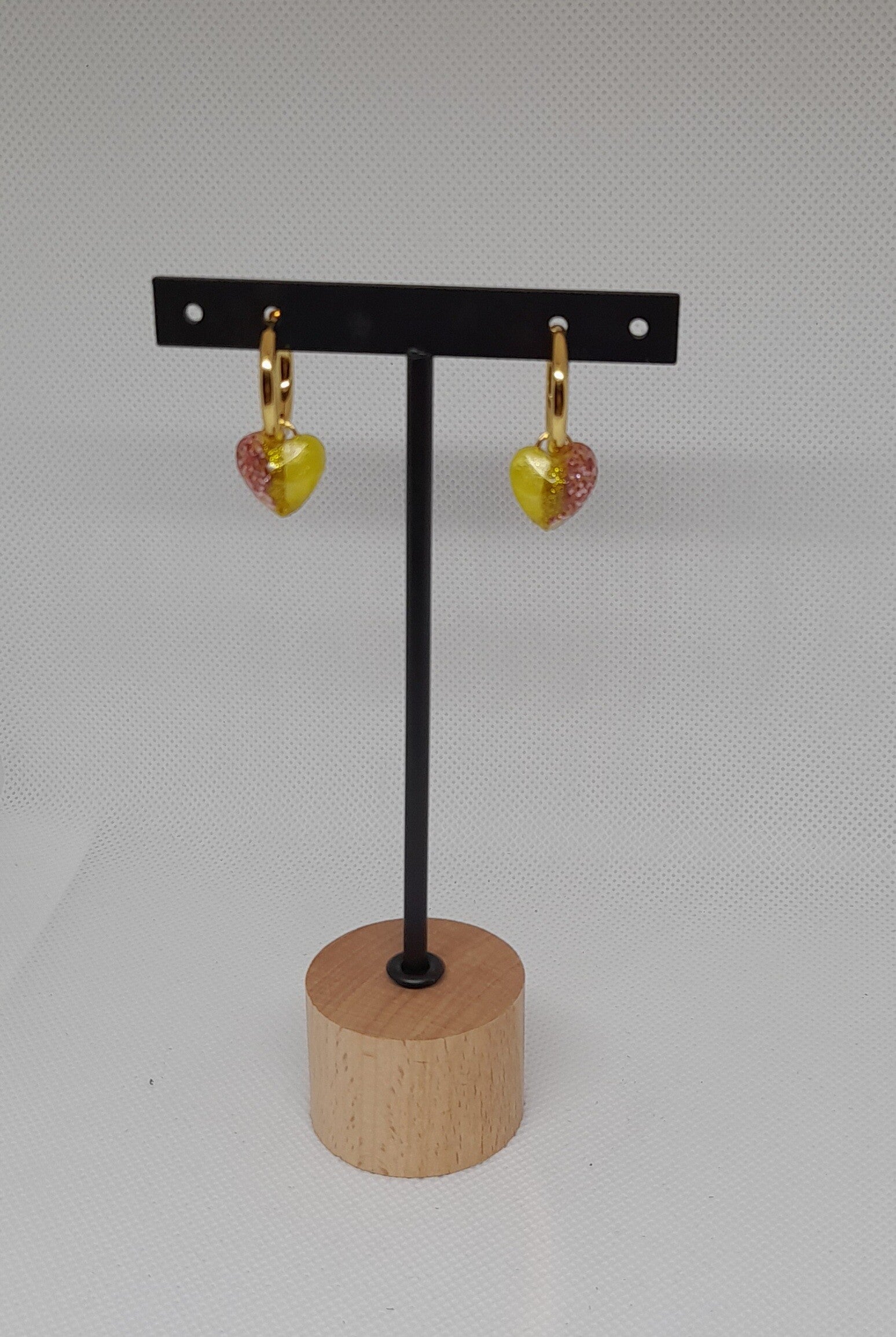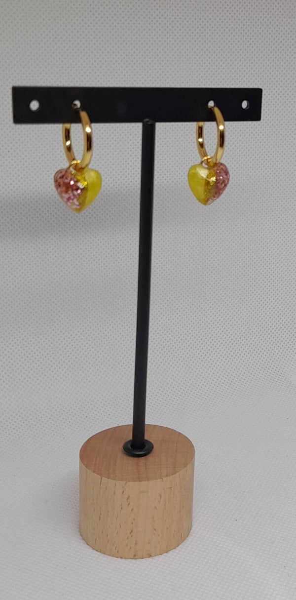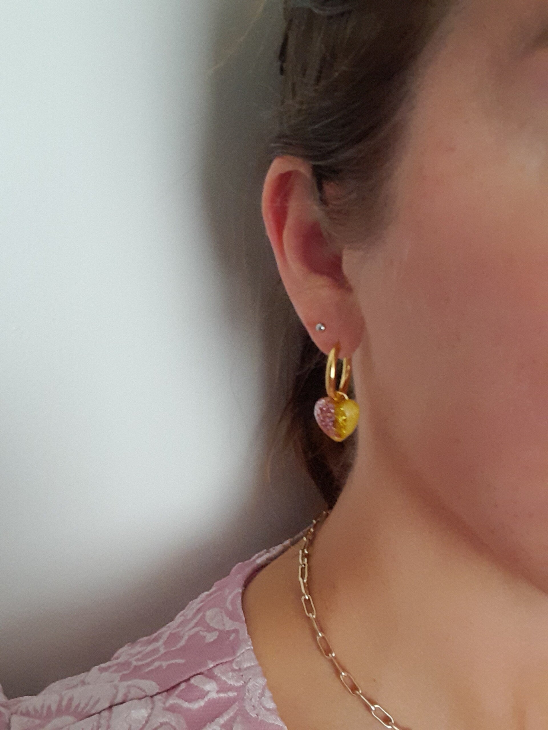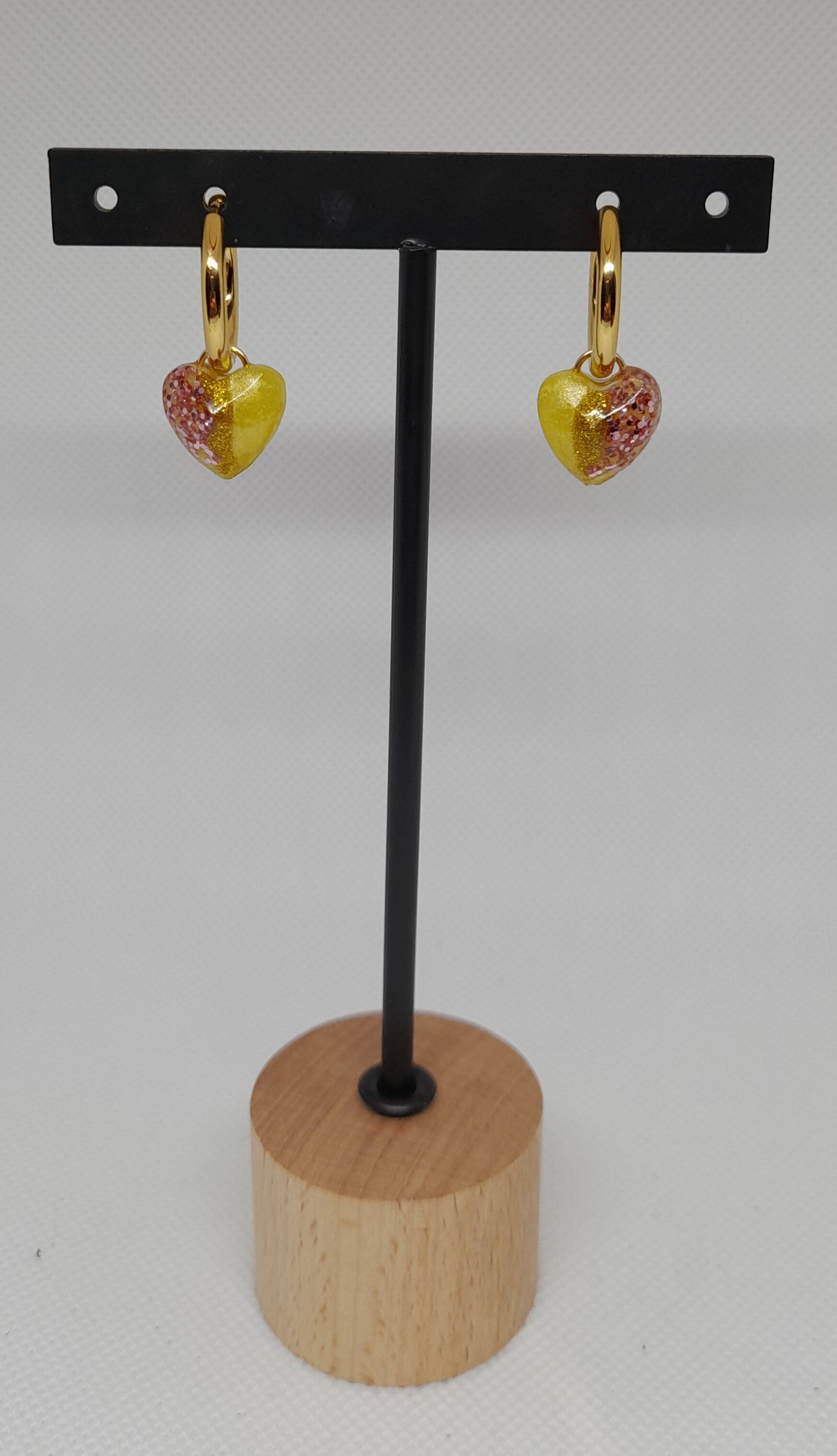 Voeg een speelse en stijlvolle touch toe aan je look met deze prachtige goudkleurige oorringen van roestvrij staal. De oorringen zijn afgewerkt met hartvormige hangers van epoxy, waarin roze, geel en goudkleurige glitter elegant samenkomen. De combinatie van zomerse kleuren en subtiele glinstering zorgt voor een vrolijke en toch chique uitstraling.