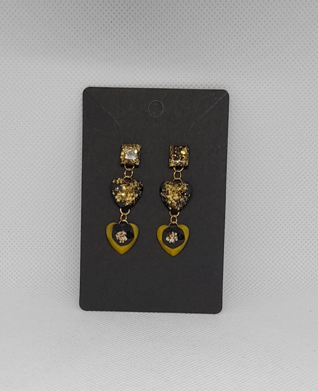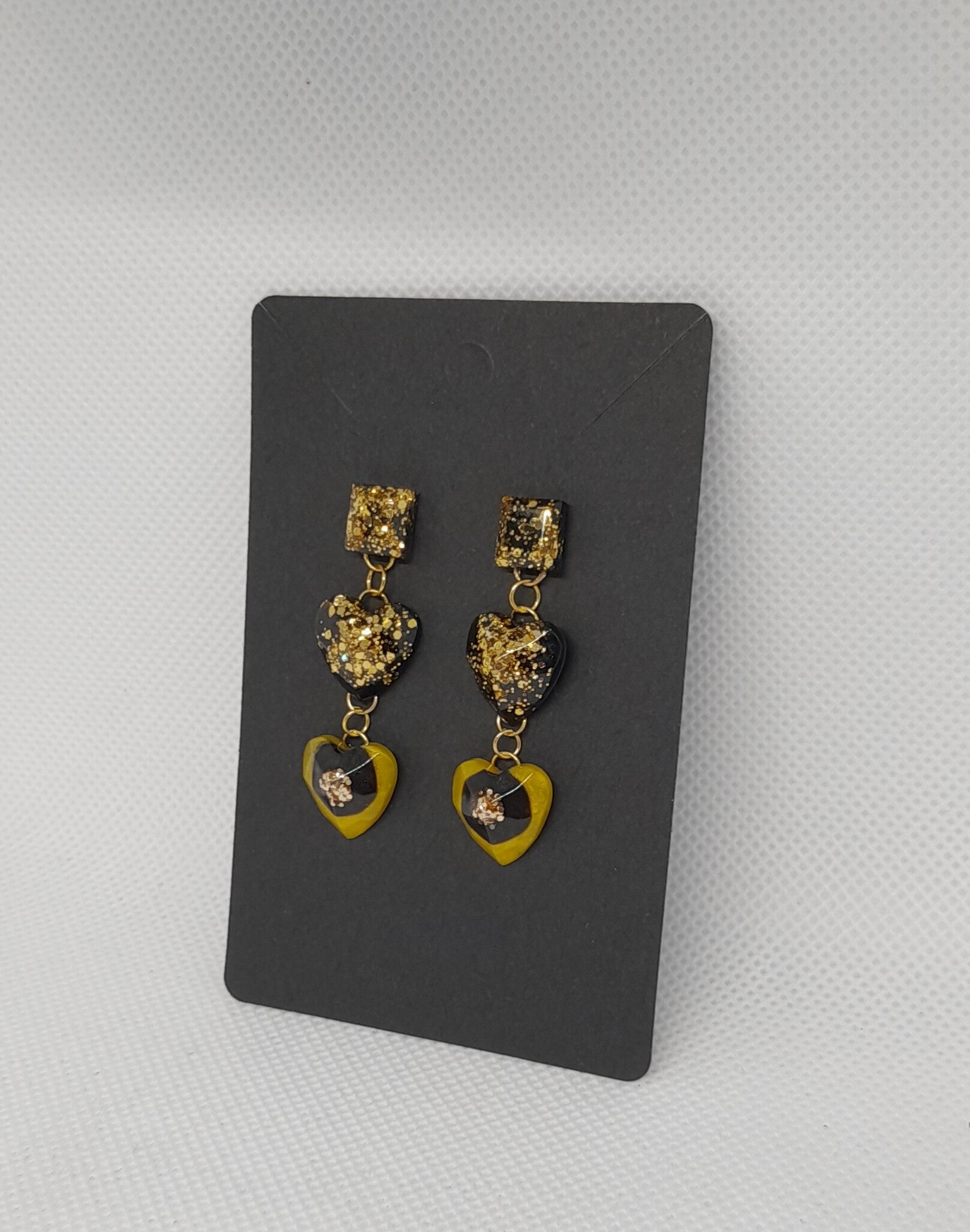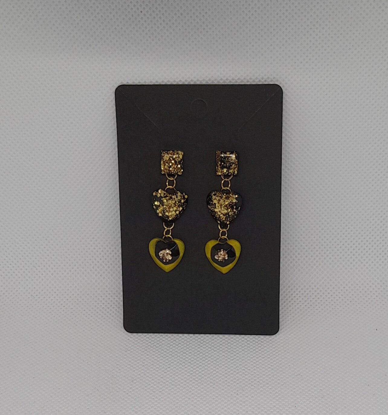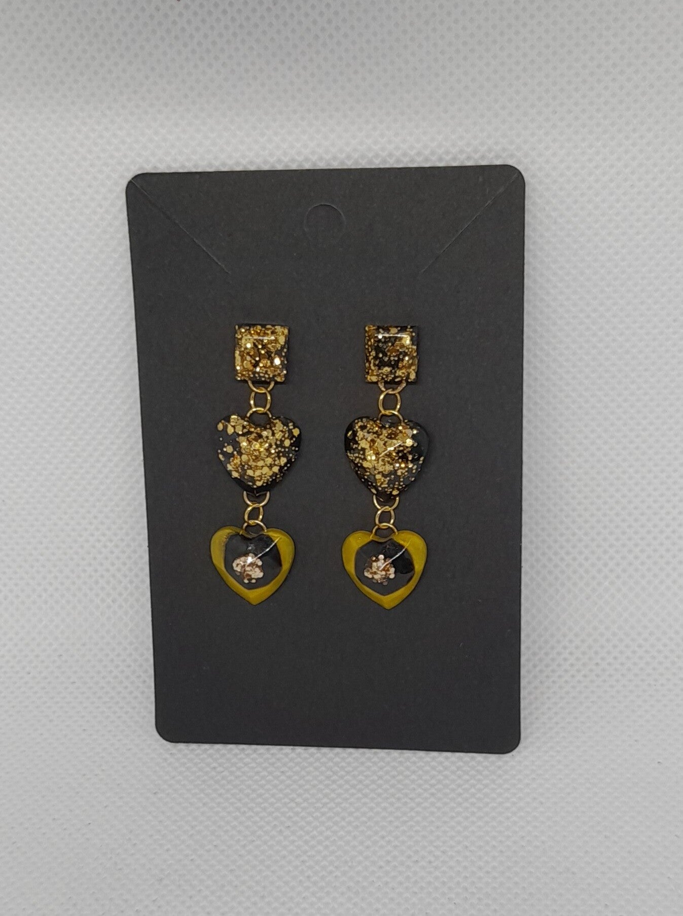 Laat je look stralen met deze elegante en speelse oorbellen, handgemaakt van epoxy en goudkleurig roestvrij staal. Deze oorbellen bestaan uit drie onderdelen: een glinsterend vierkant bovenstuk, gevolgd door een hartje met gouden glitter op een diepzwarte basis, en onderaan een goudgeel hartje met zwart en goudglitter.
