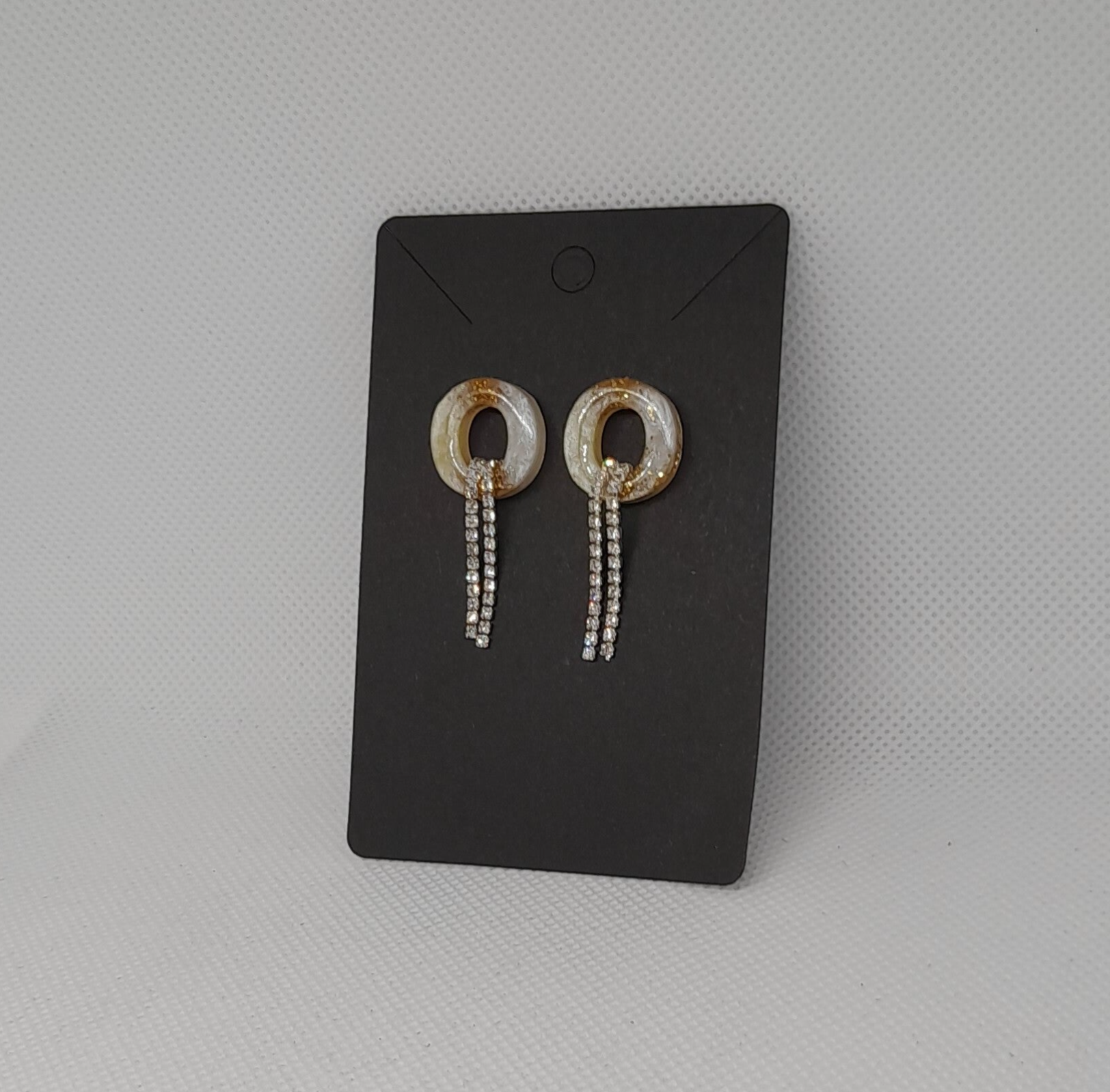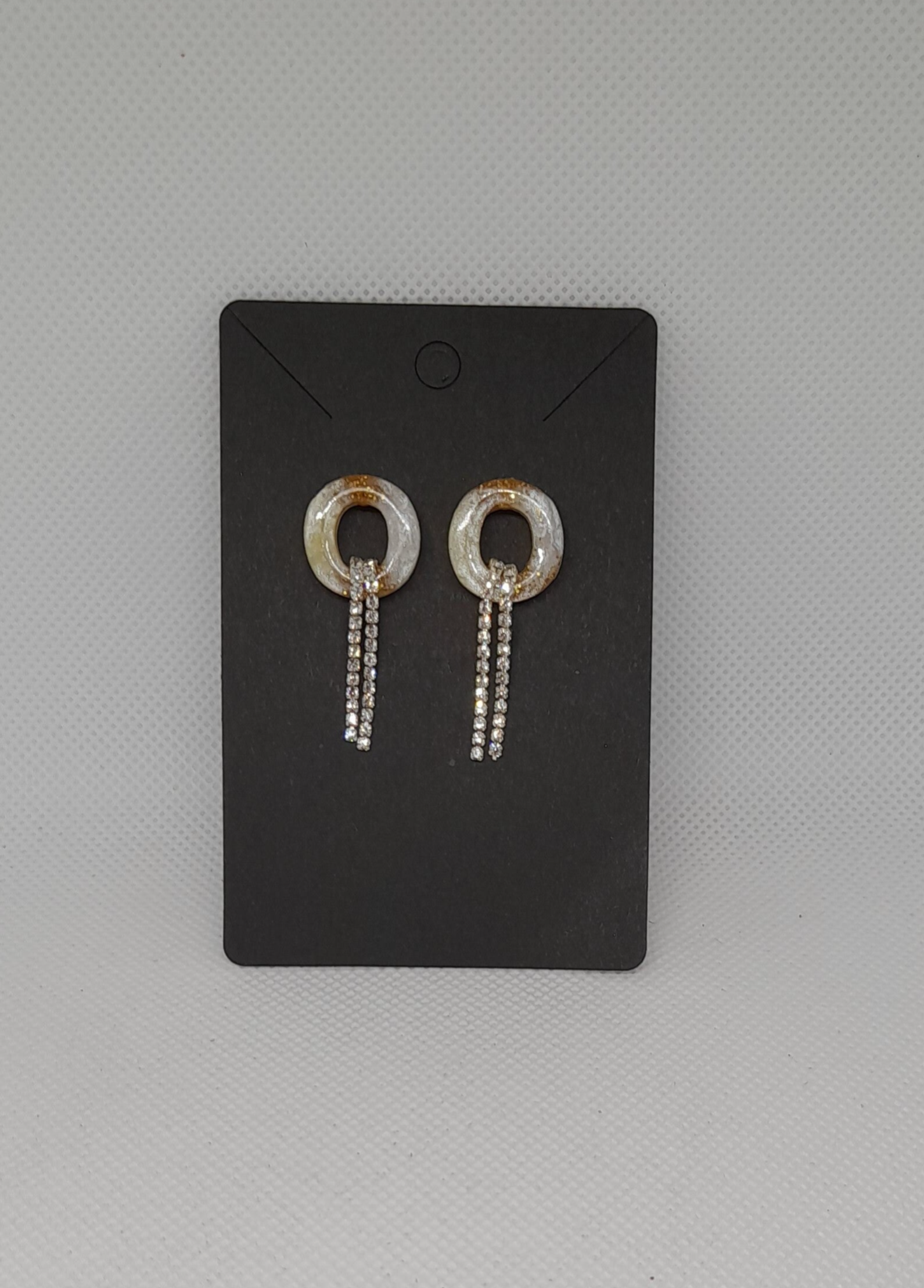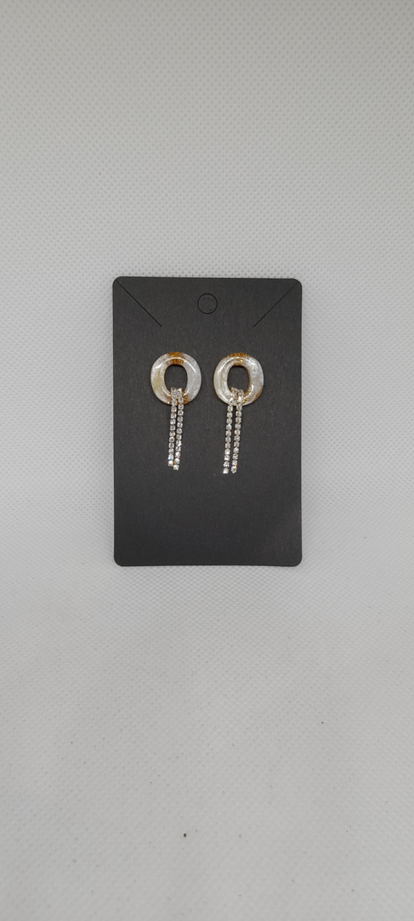 Elegante oorbellen met een glanzende epoxy ring in parelmoertint, afgewerkt met twee sierlijke strengen van fonkelende strass steentjes. De combinatie van glans en beweging zorgt voor een speelse, maar chique uitstraling. De roestvrijstalen oorstekers maken ze geschikt voor dagelijks gebruik én gevoelige oren.