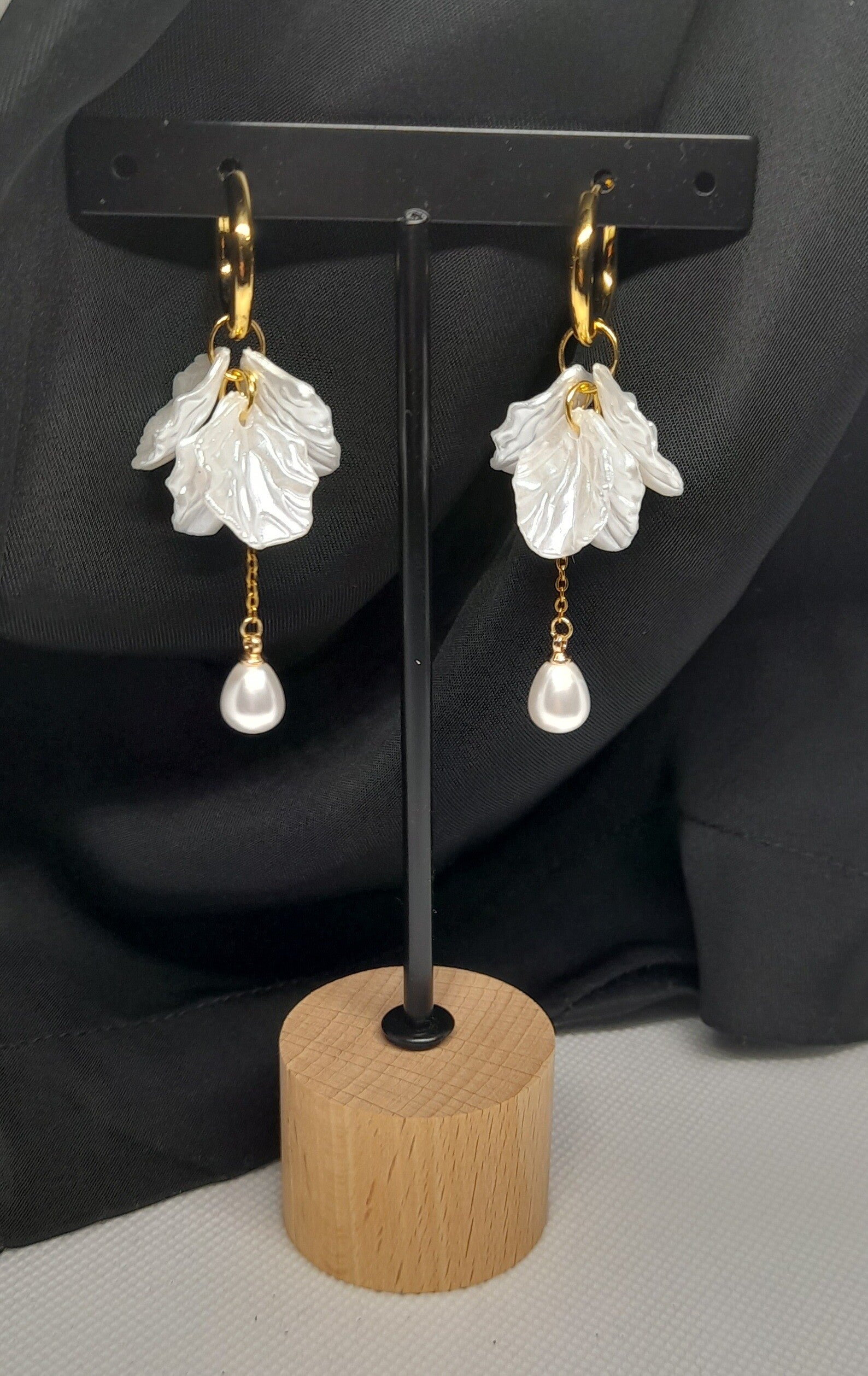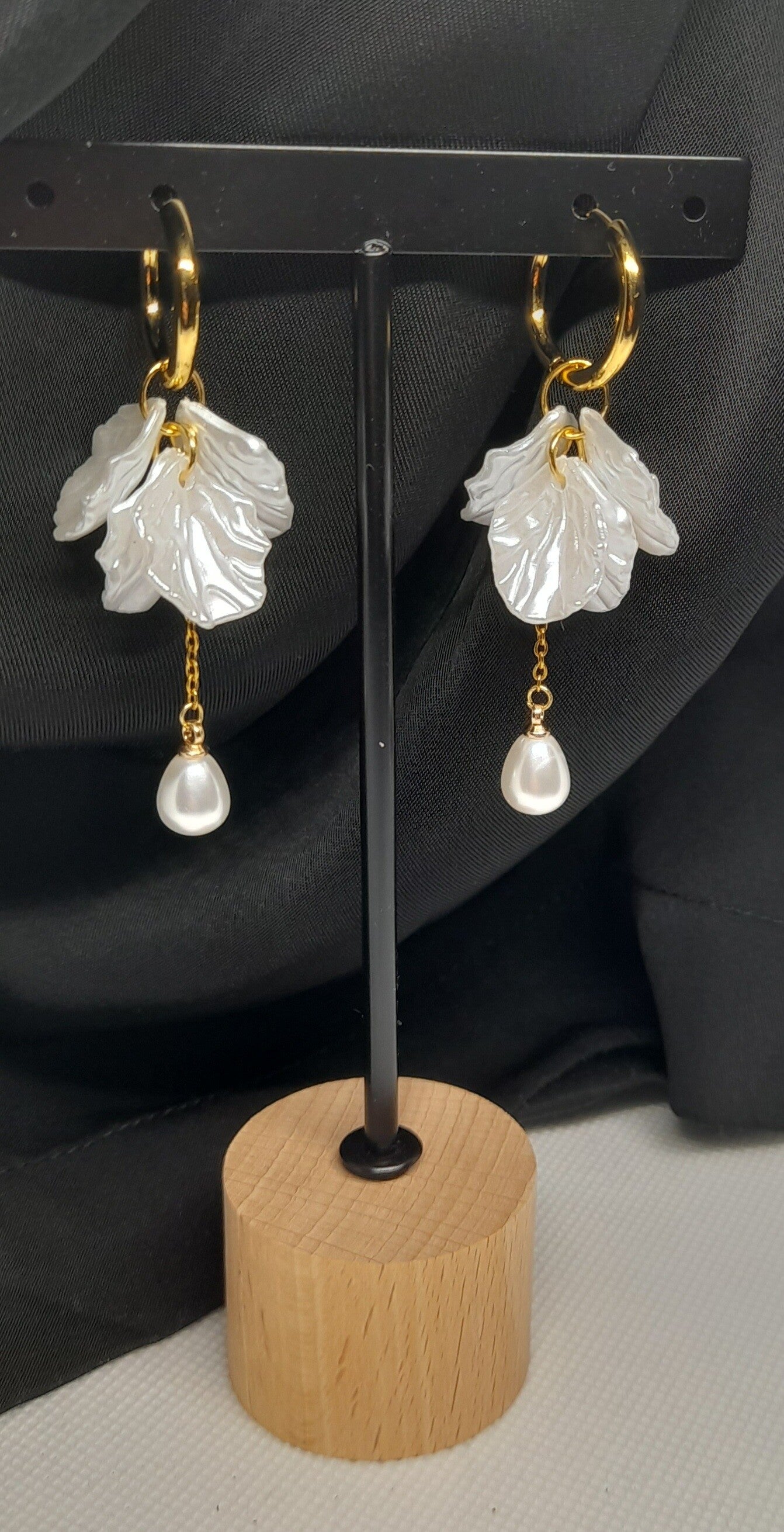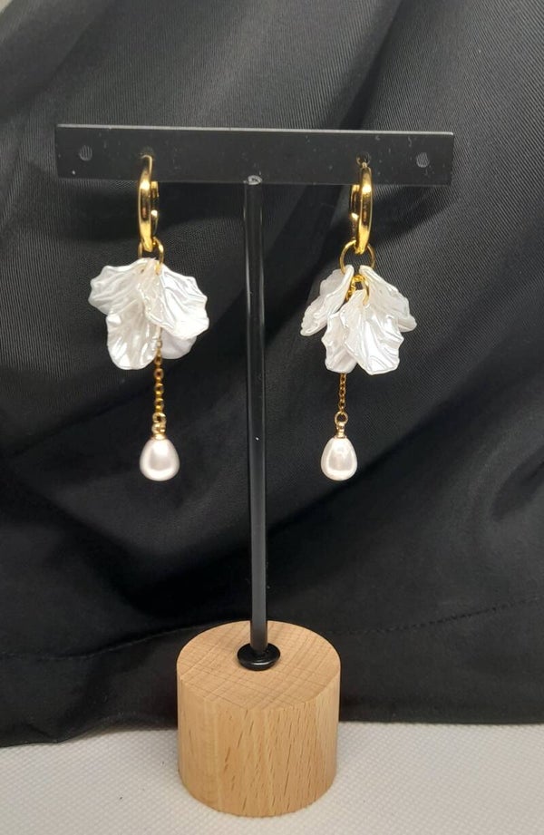 Elegante oorbellen met goudkleurige roestvrijstalen oorringen, afgewerkt met een glanzend parelmoerwit blad en een druppelvormige parelbedel. Tijdloos en stijlvol – ideaal voor zowel dagelijks gebruik als speciale gelegenheden.
