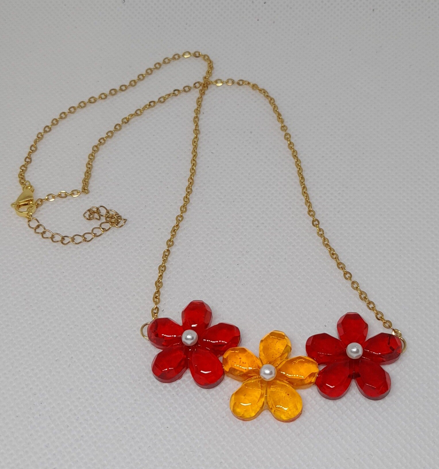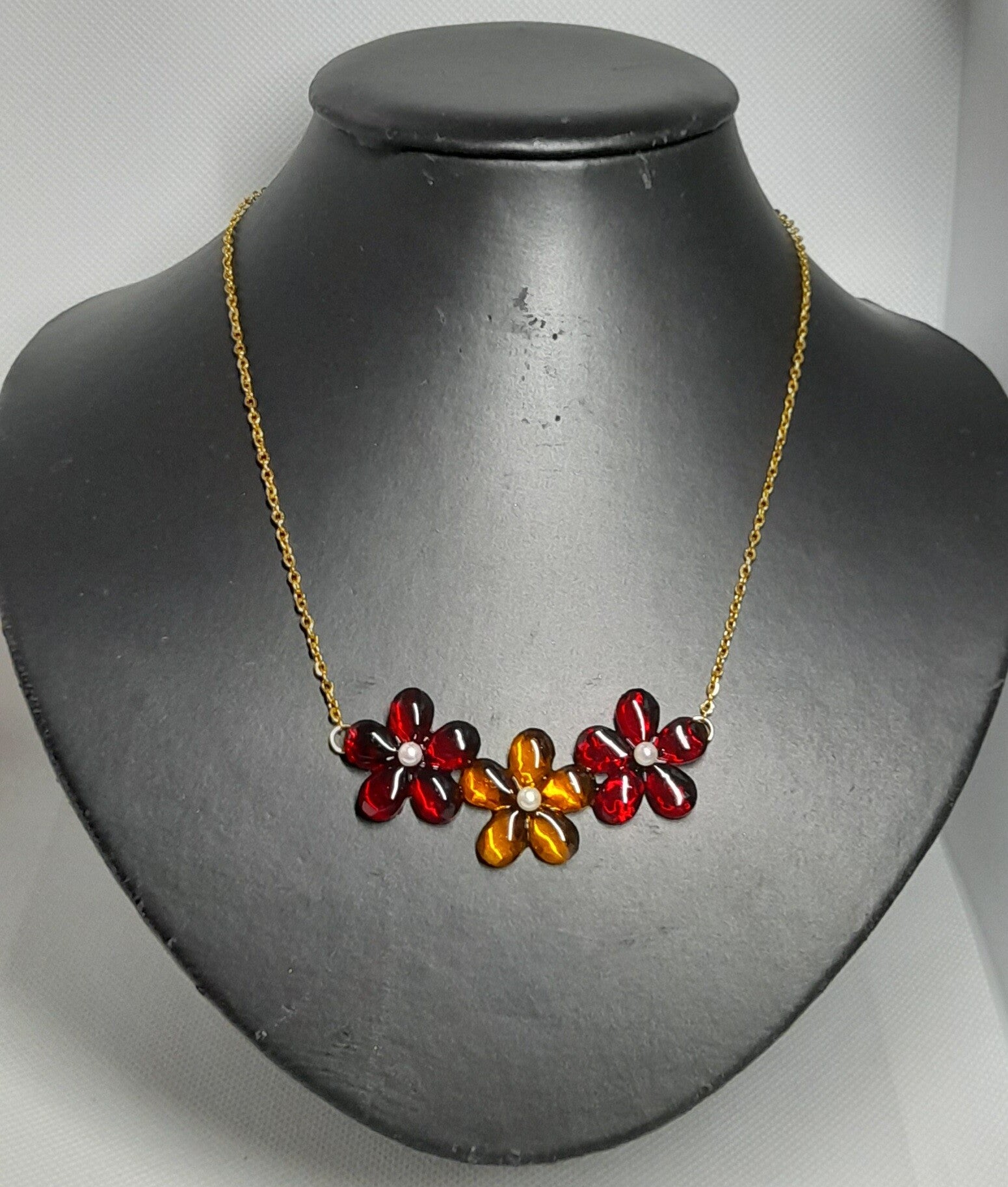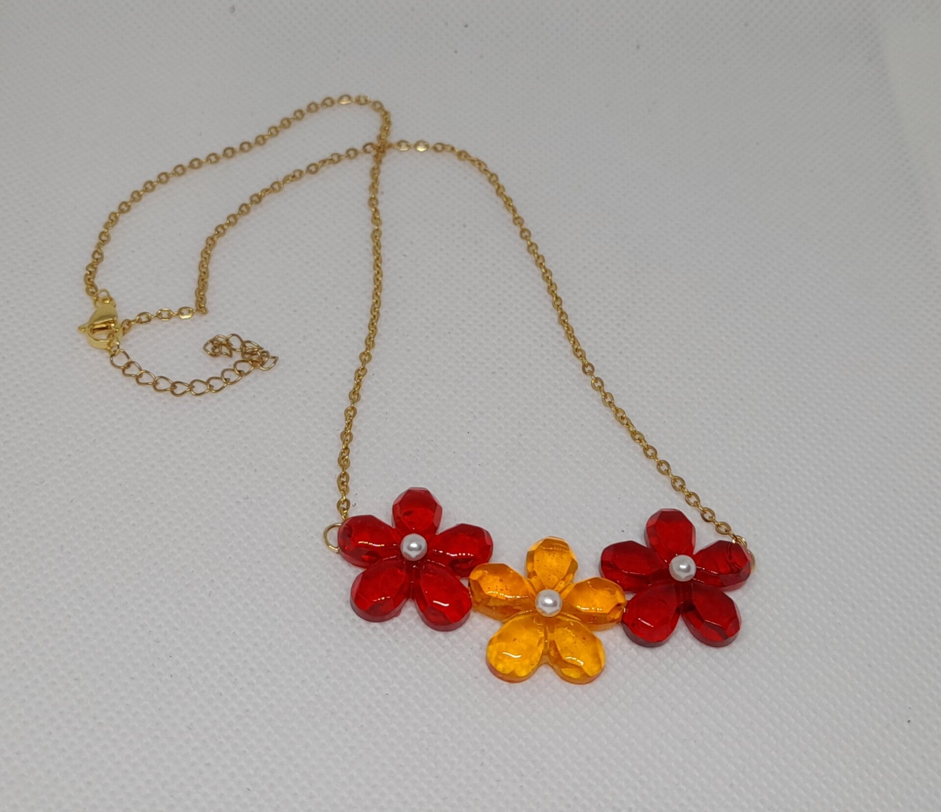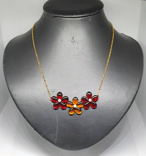 Geef je outfit een speelse en kleurrijke touch met deze charmante bloemenketting! Deze handgemaakte ketting bestaat uit een fijne goudkleurige roestvrijstalen ketting, versierd met drie opvallende bloemen gemaakt van glanzende epoxyhars.