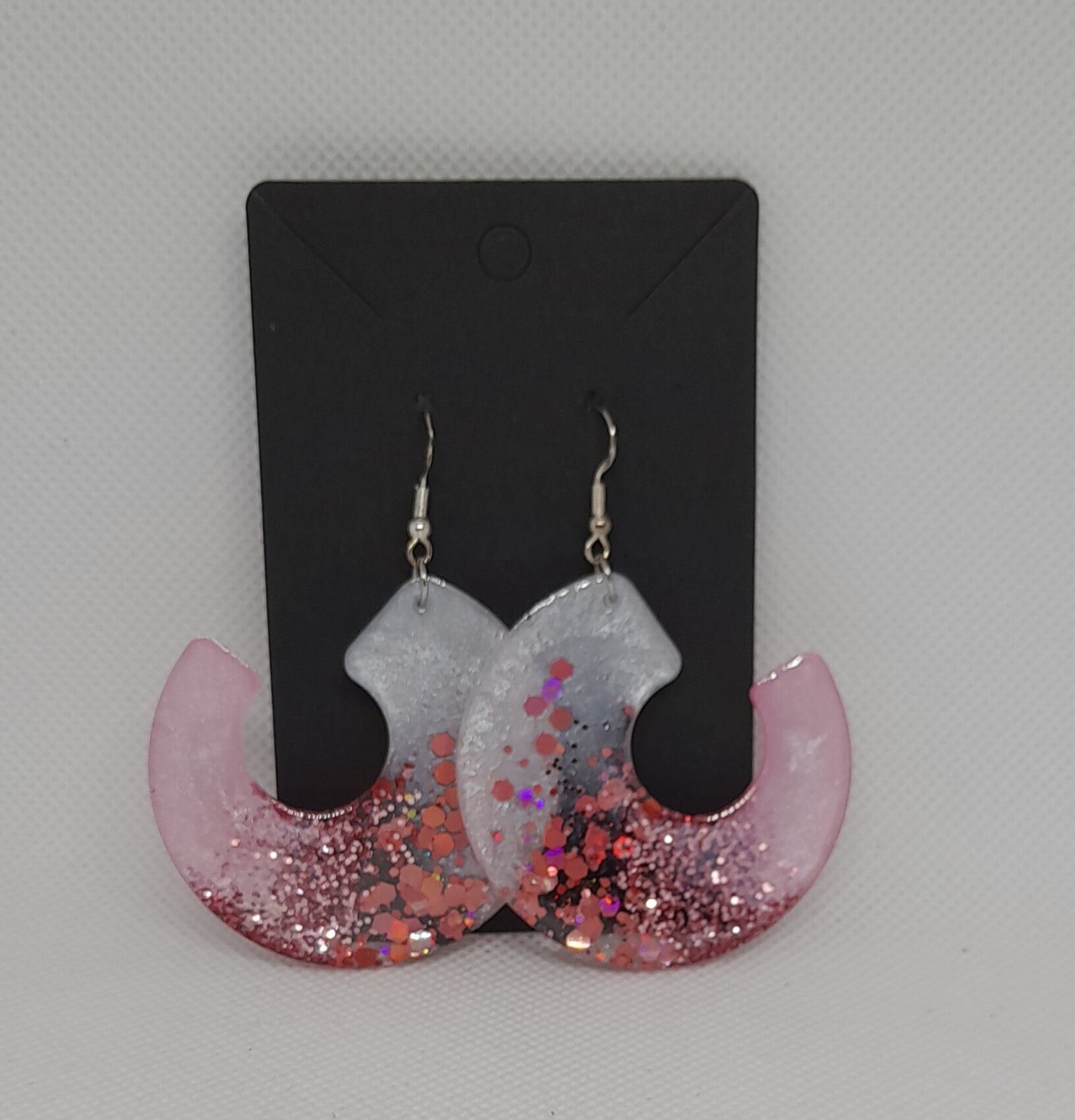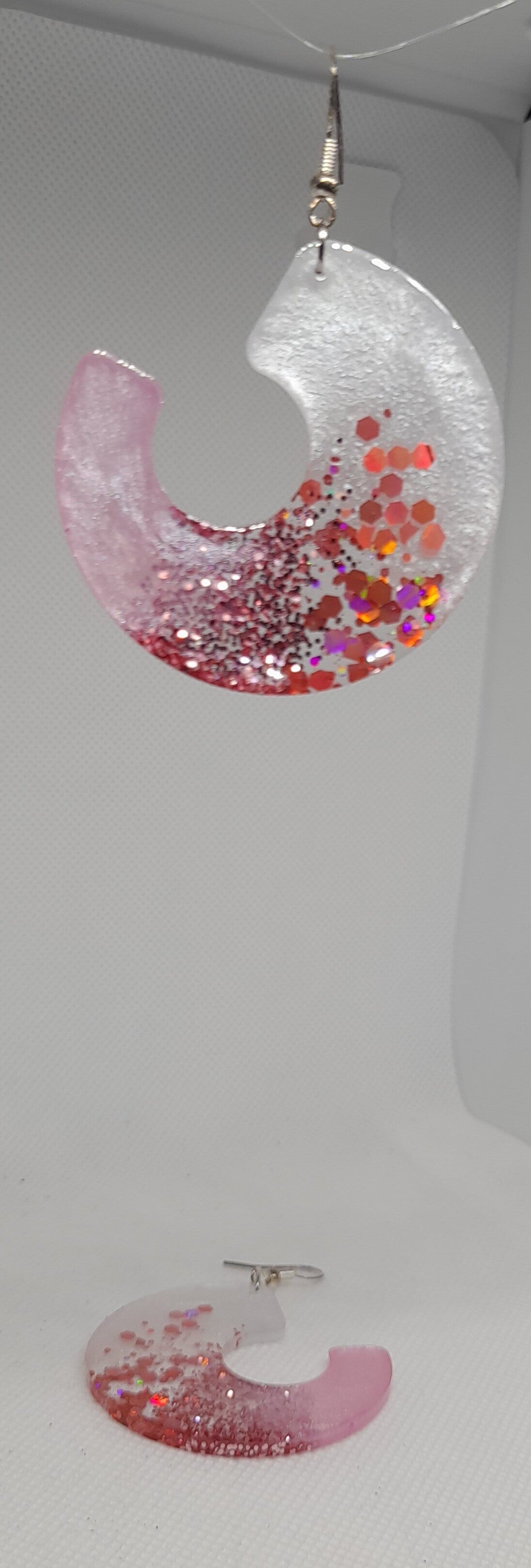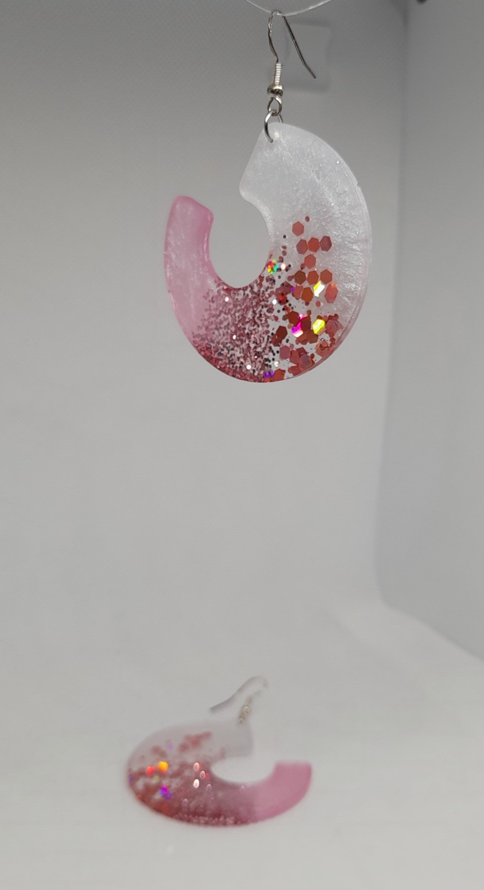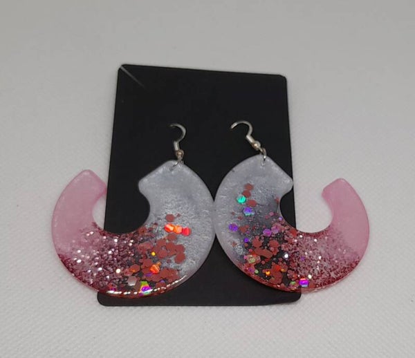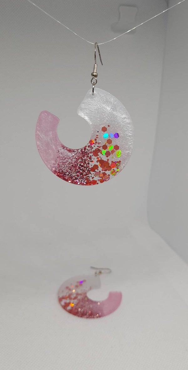 Laat je stijl schitteren met deze unieke handgemaakte epoxy oorbellen in een moderne halve cirkelvorm. De oorbellen combineren een zachte roze tint, met wit parelmoer en glinsterende rood/roze glitters voor een elegante look.