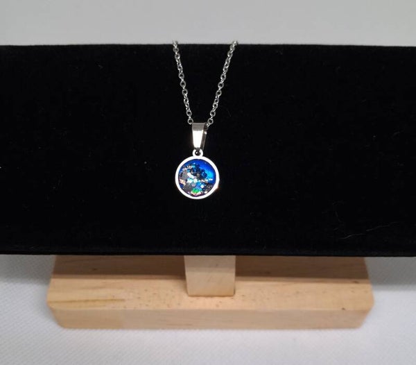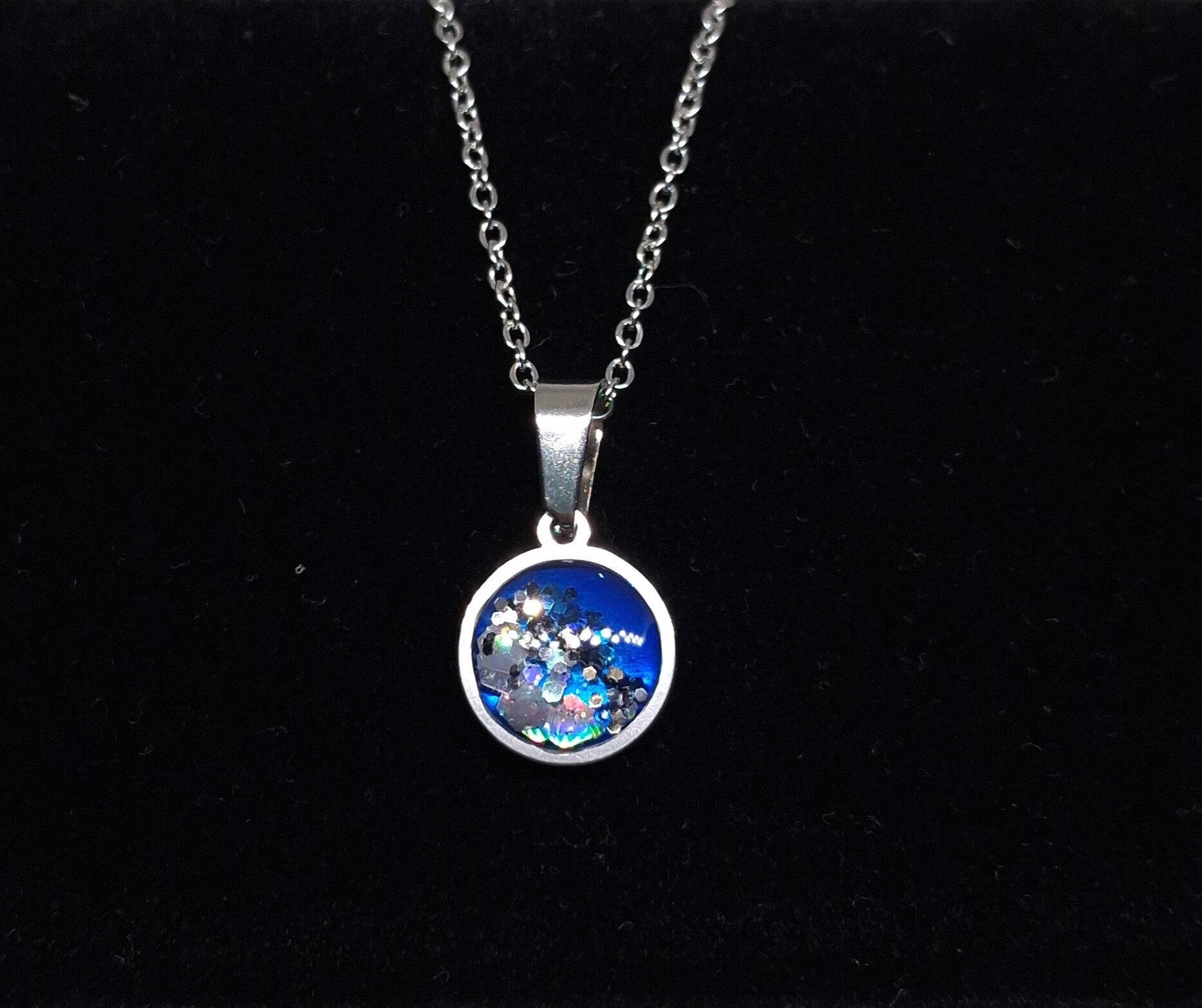 Deze handgemaakte ketting heeft een ronde hanger van roestvrij staal met een diepe blauwe kleur epoxy. In de epoxy zijn kleine en grote glitters verwerkt die prachtig schitteren in het licht.