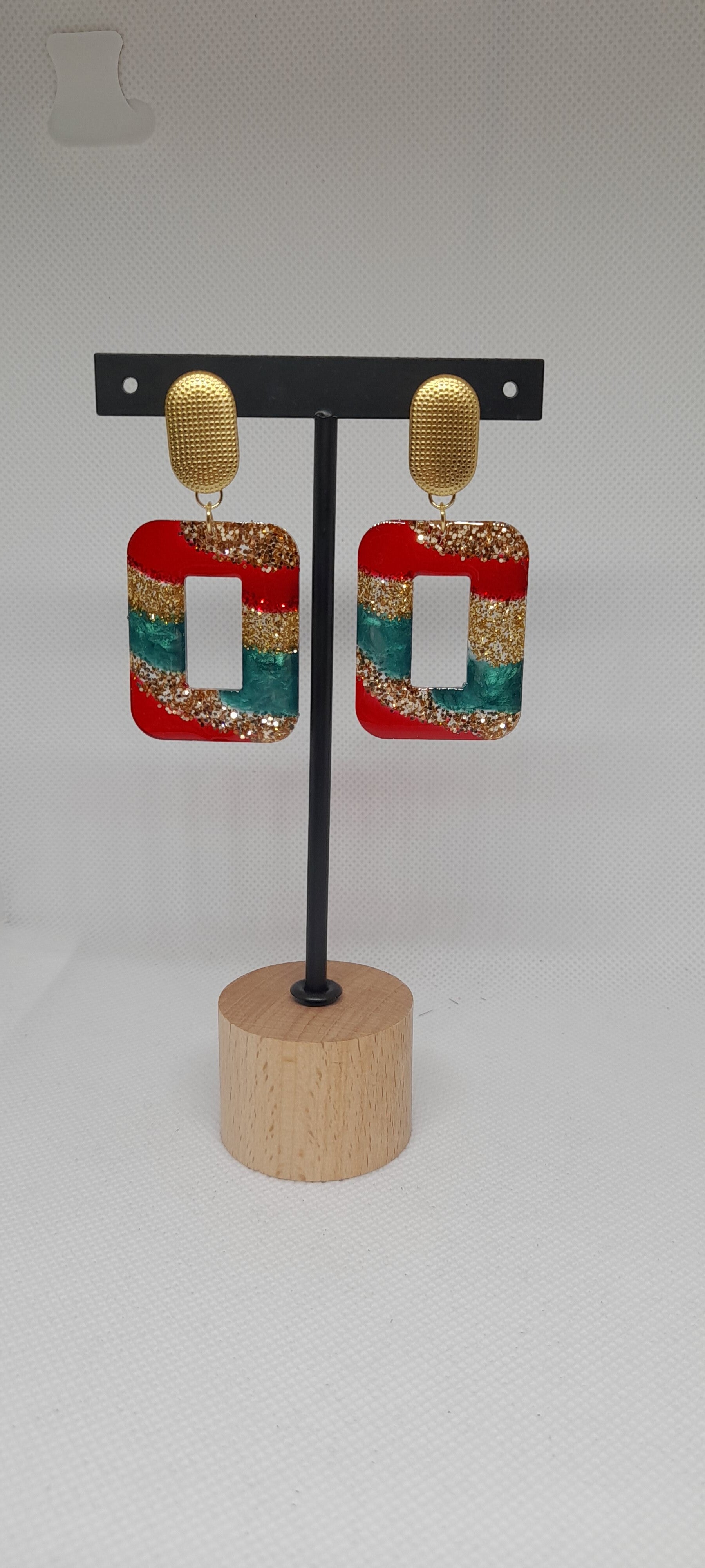 Deze oorbellen met roestvrijstalen oorknoppen en mooie gekleurde hangers in groen, donkerrood en goud glitter, zijn echte blikvangers! Maak je outfit helemaal af met deze leuke oorbellen, ondanks de grootte zijn ze licht van gewicht.