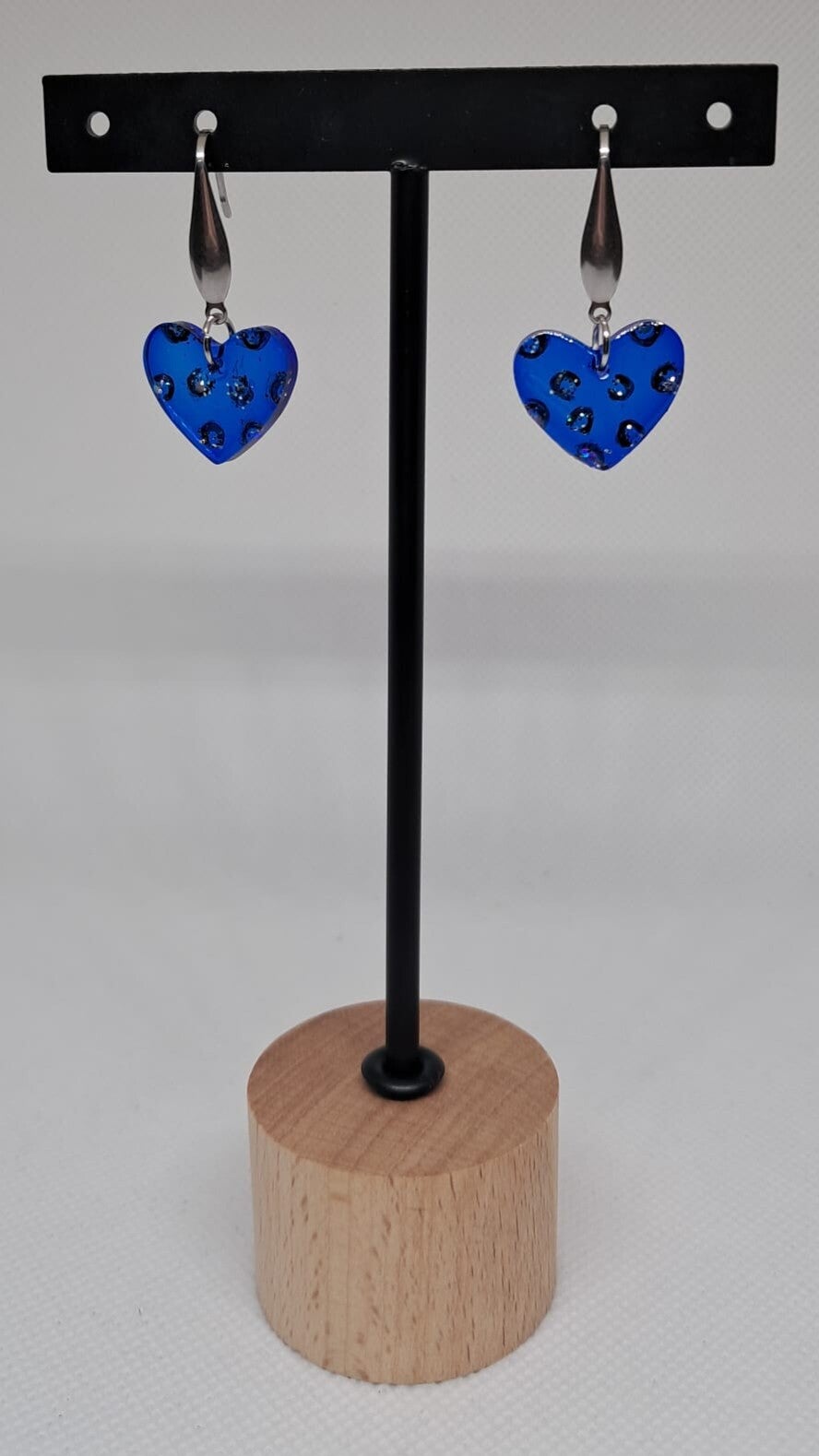 Deze stijlvolle handgemaakte oorbellen combineren roestvrij staal met koningsblauwe epoxy hartjes. De glanzende blauwe hangers hebben een subtiele panterprint in zwart met zilverglitter.