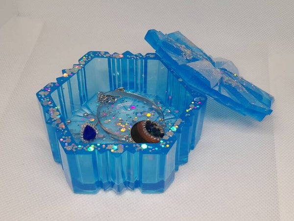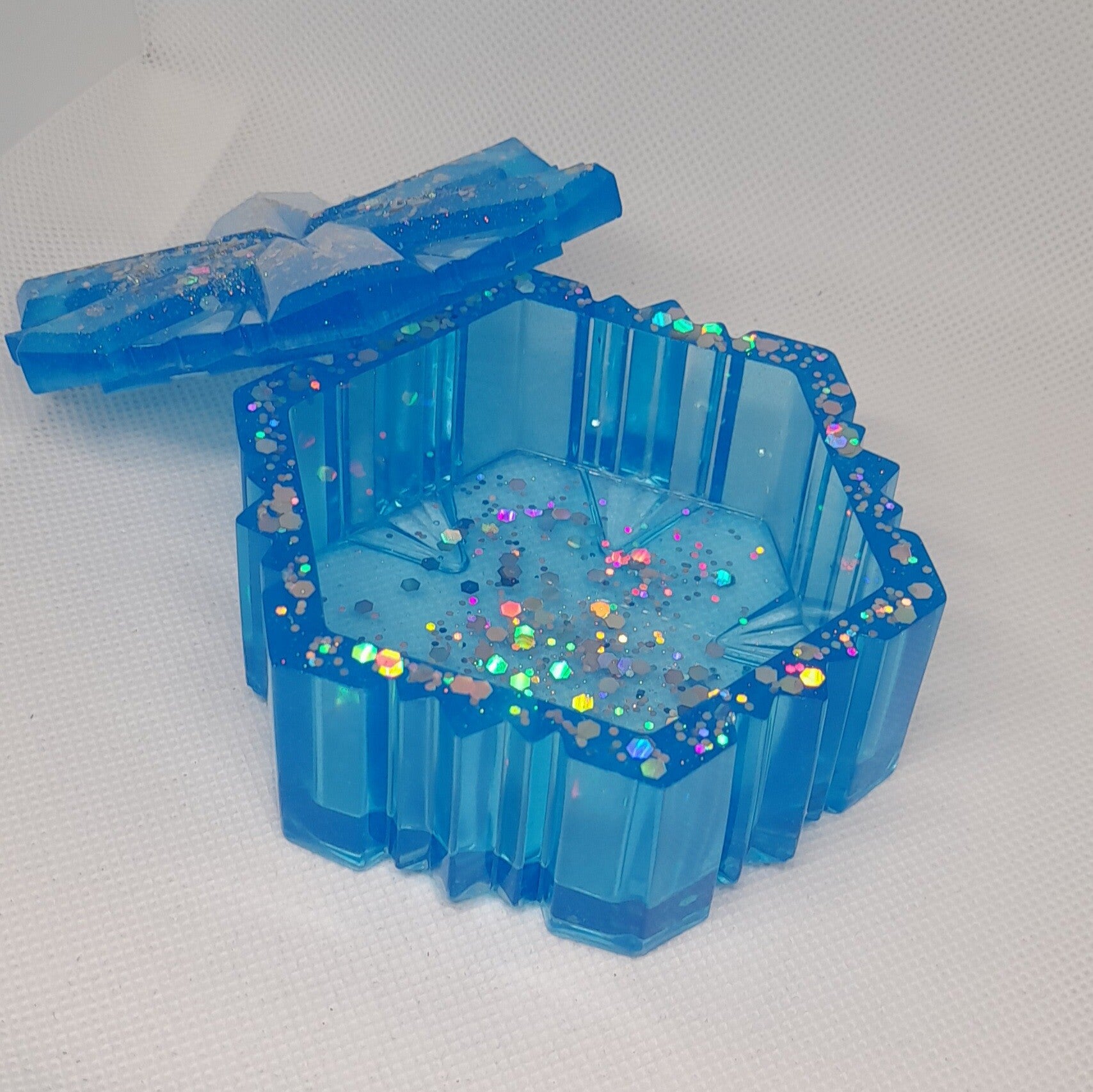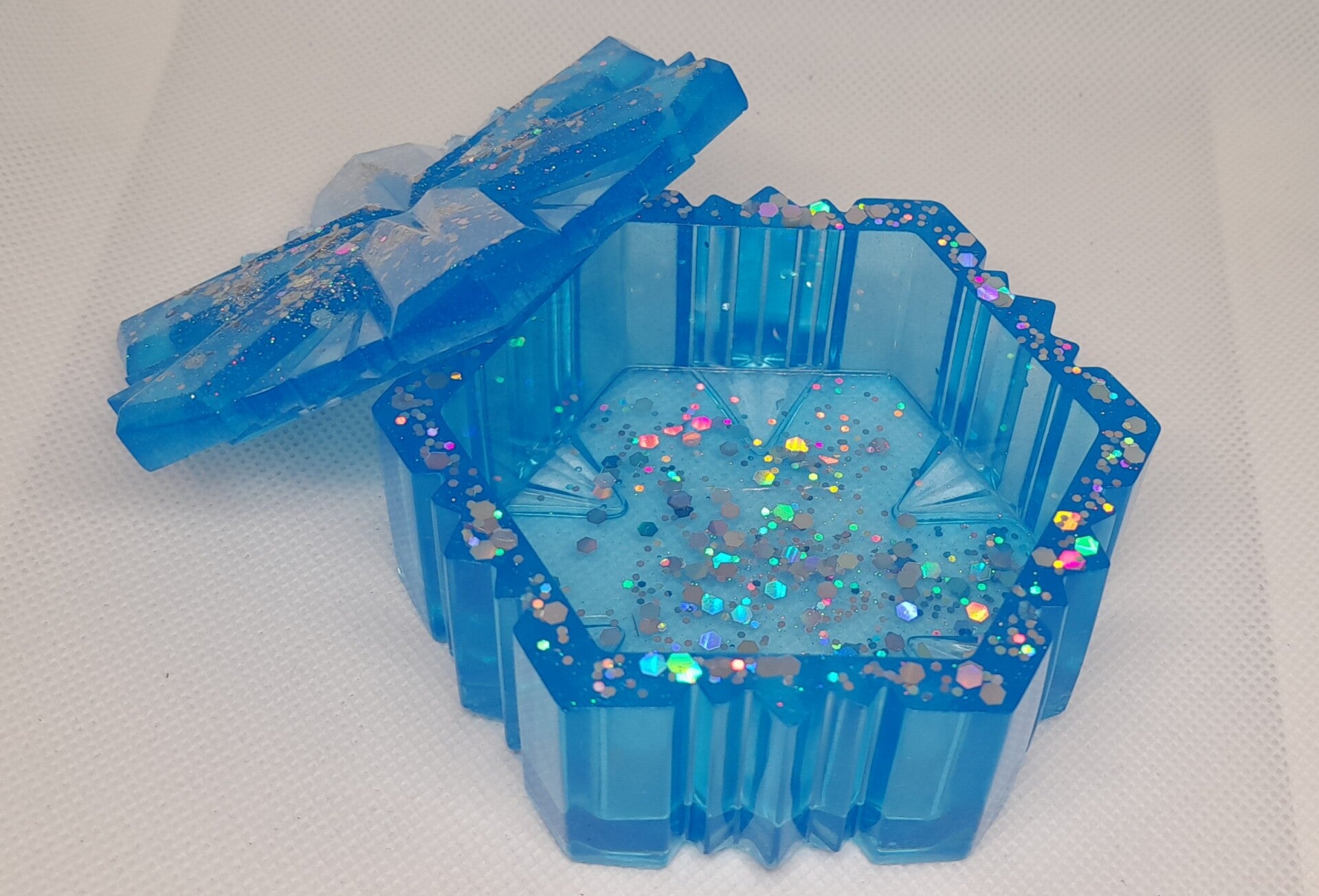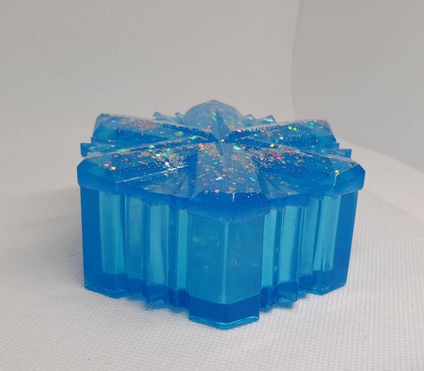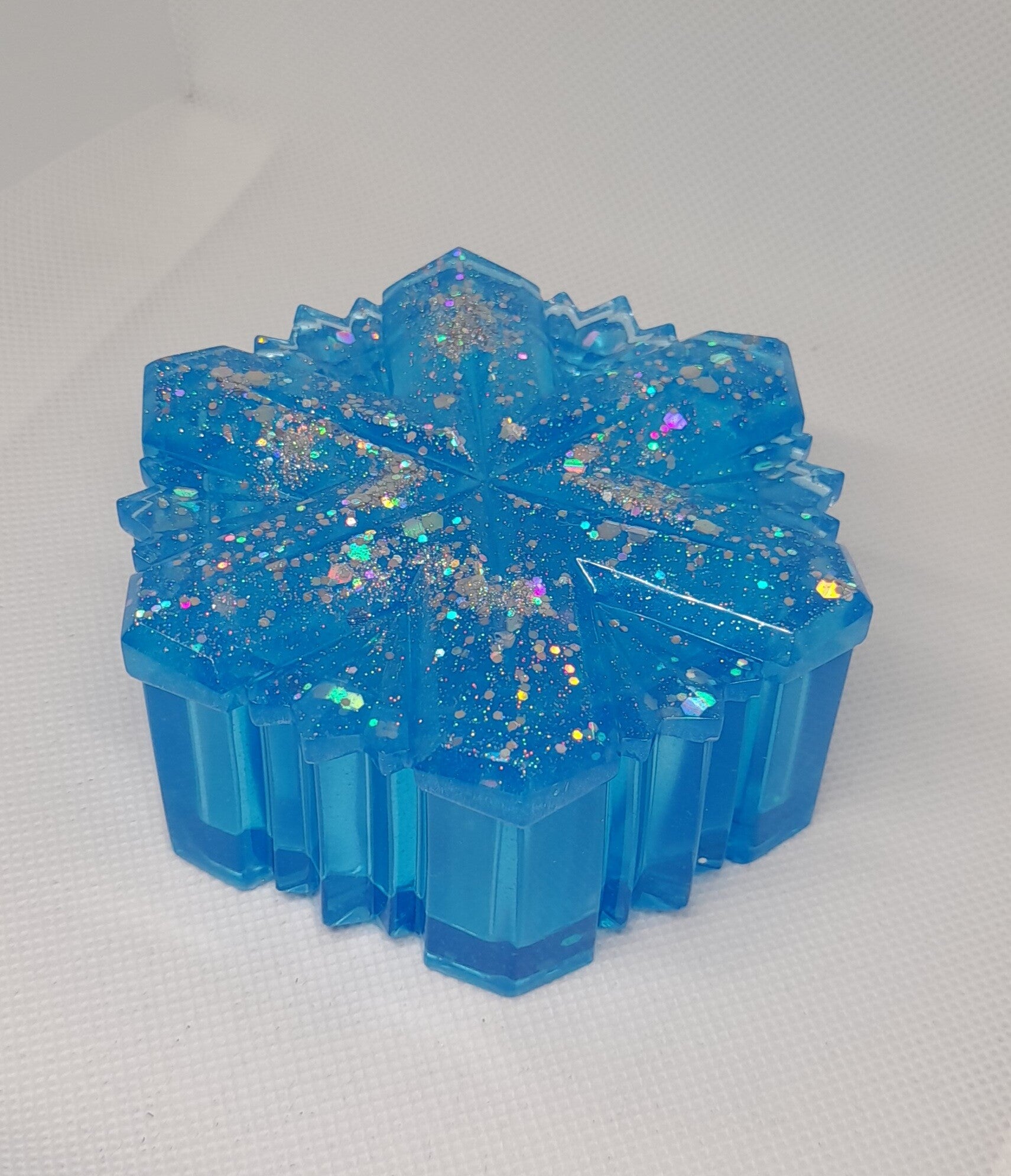 Bewaar je mooiste kleine schatten in stijl met dit betoverende handgemaakte doosje van epoxy. Het doosje heeft de vorm van een elegante sneeuwvlok en is gegoten in helder ijsblauw epoxyhars. De glinsterende en iriserende glittertjes geven het geheel een magisch, winterachtig effect dat schittert vanuit elke hoek.