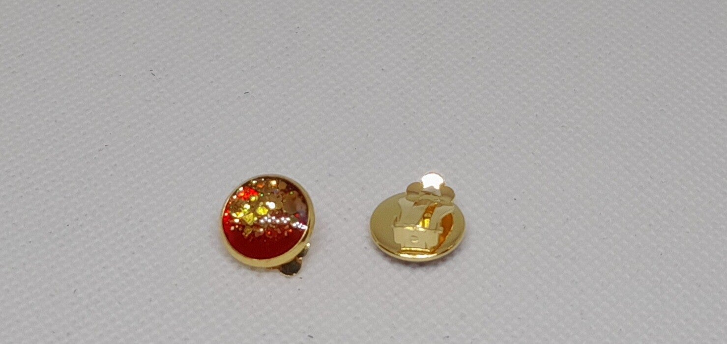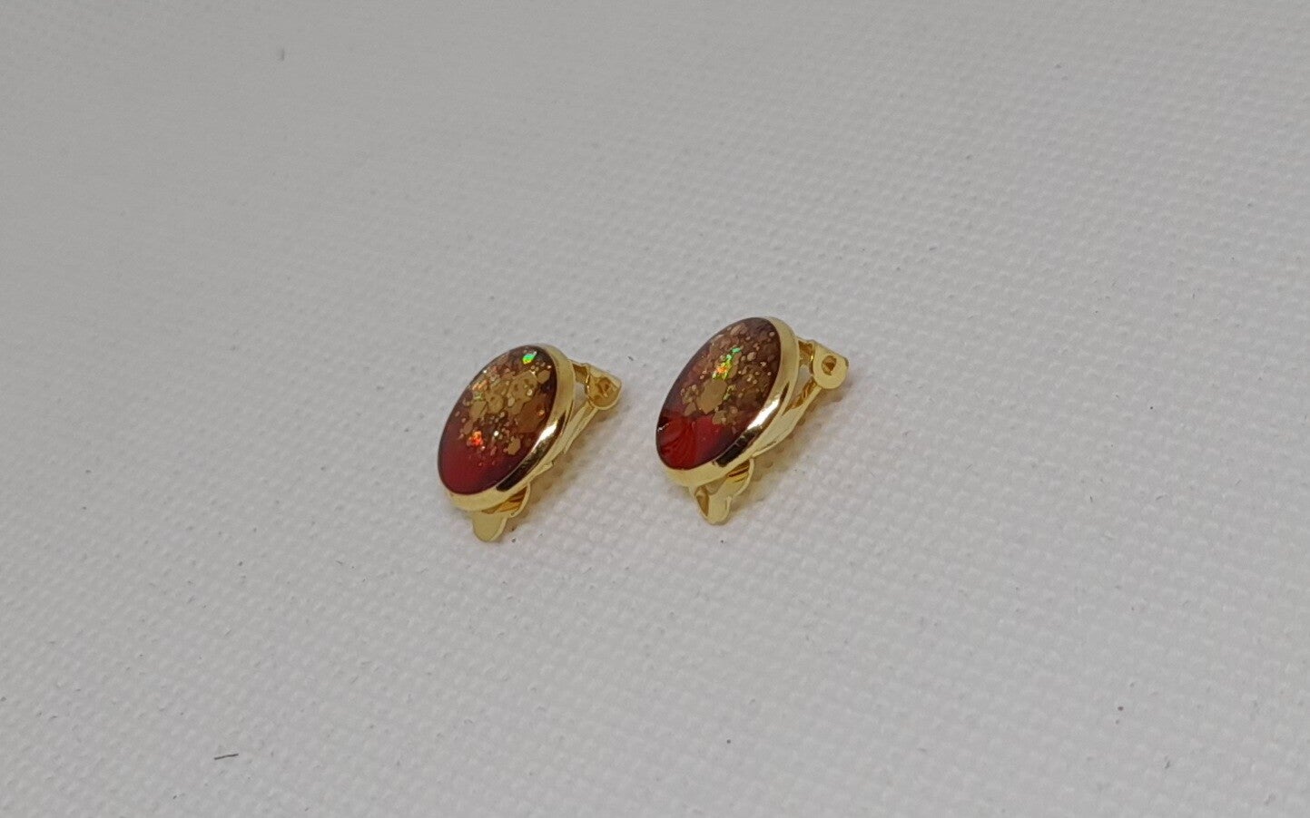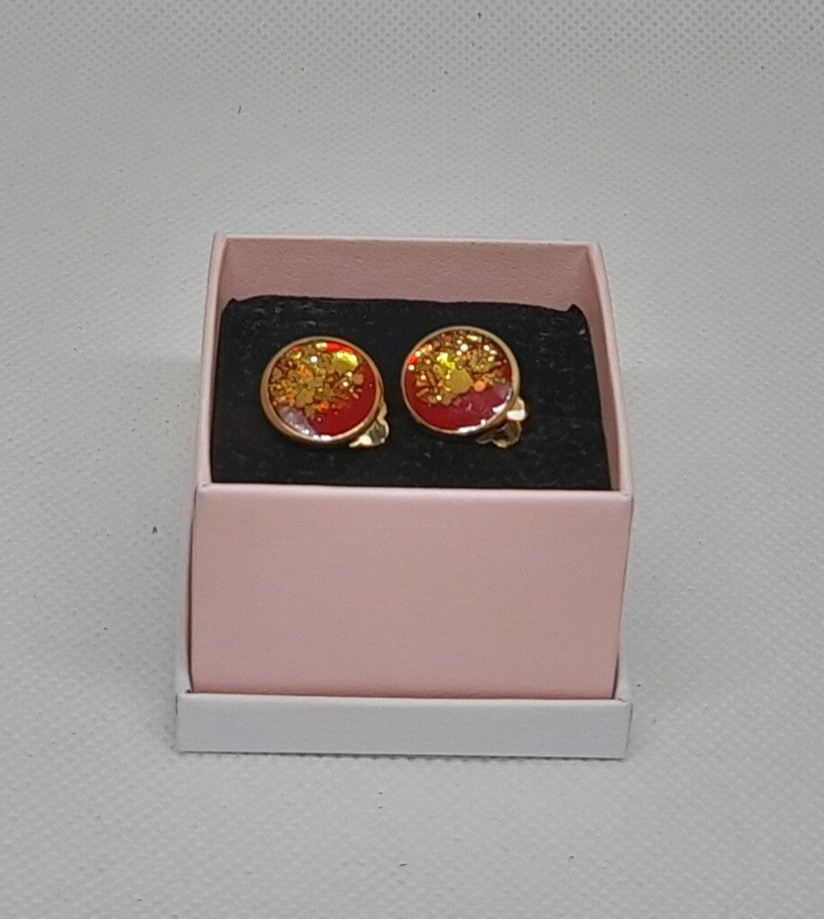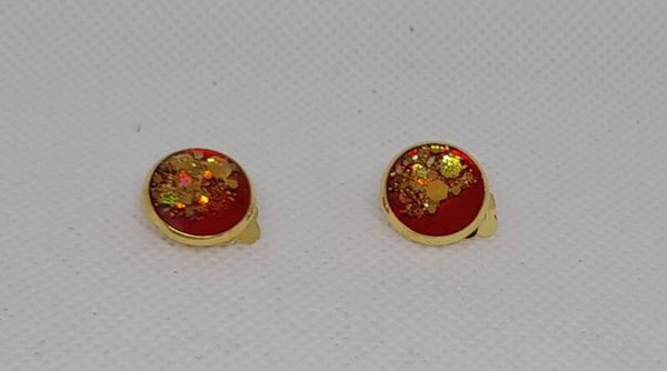 Deze unieke clipoorbellen zijn met de hand gemaakt en combineren een warme rode epoxybasis met sprankelende goudkleurige glitters voor een luxe en speels effect.