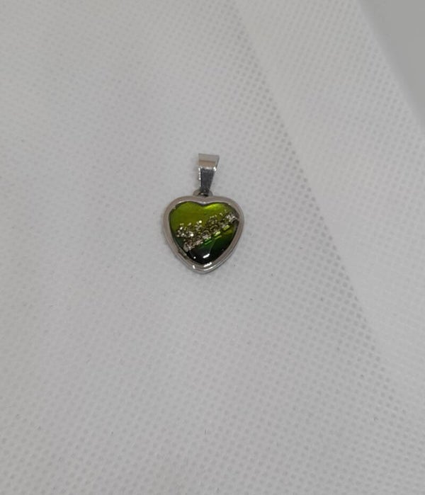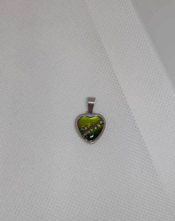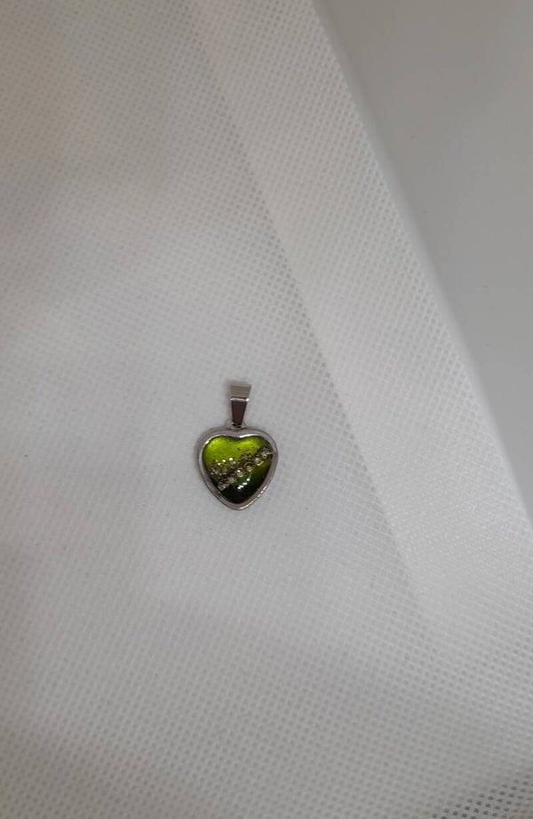 Deze kleine, verfijnde hanger is gemaakt van hoogwaardig roestvrijstaal en epoxy. Het hartvormige ontwerp heeft een levendige groentint met subtiele details van glitters en strassateentjes. Dankzij het compacte formaat is dit sieraad perfect voor dagelijks gebruik of om te combineren met andere kettingen.