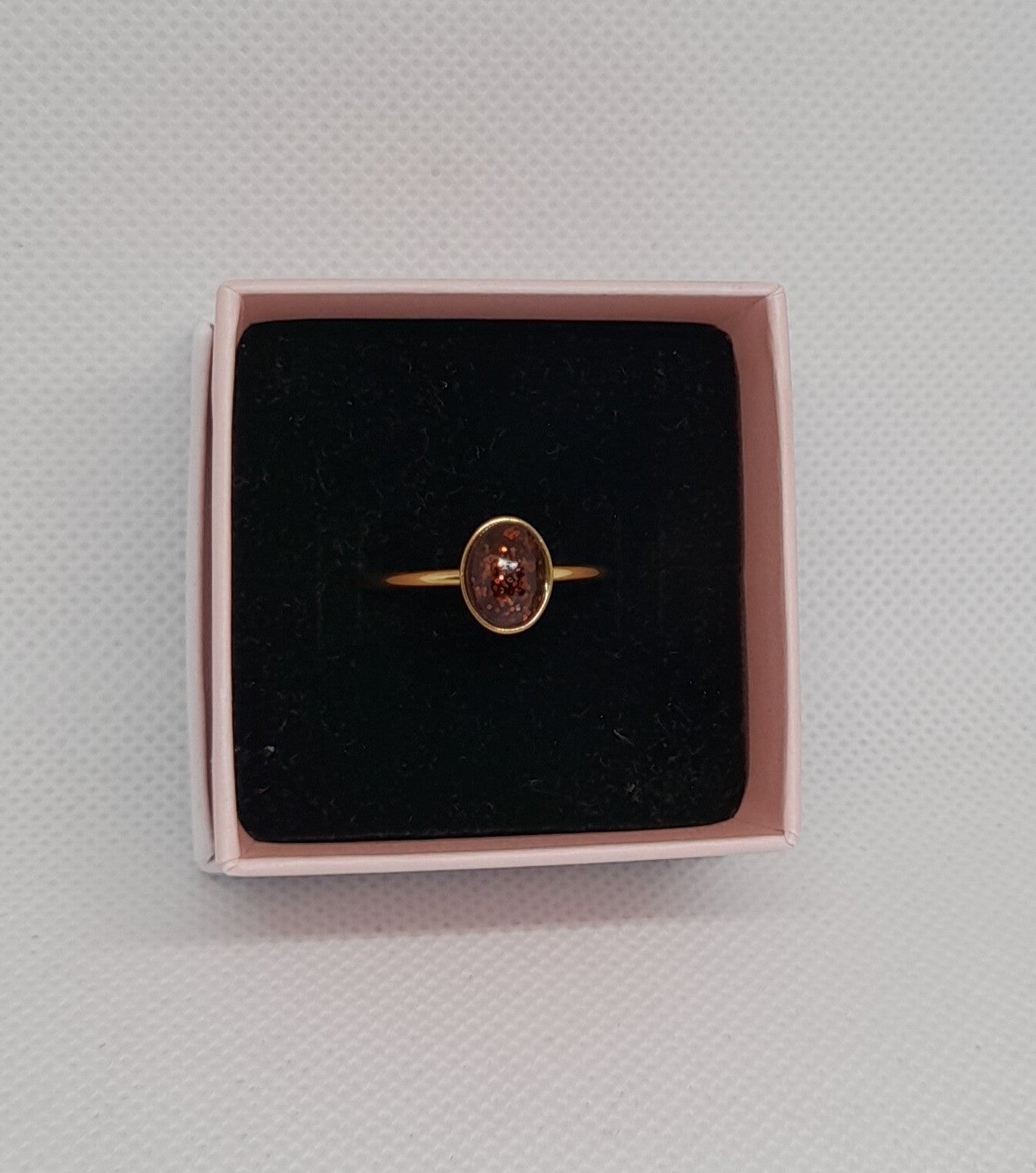 Deze elegante ring is met zorg handgemaakt en combineert modern design met tijdloze luxe. De fijne verstelbare ringband van roestvrijstaal heeft een warme, goudkleurige afwerking en draagt comfortabel om de vinger. In het midden bevindt zich een ovale epoxy steen met een diepe bruine tint en subtiele glinsteringen, die het licht prachtig vangt en de ring een verfijnde uitstraling geeft.