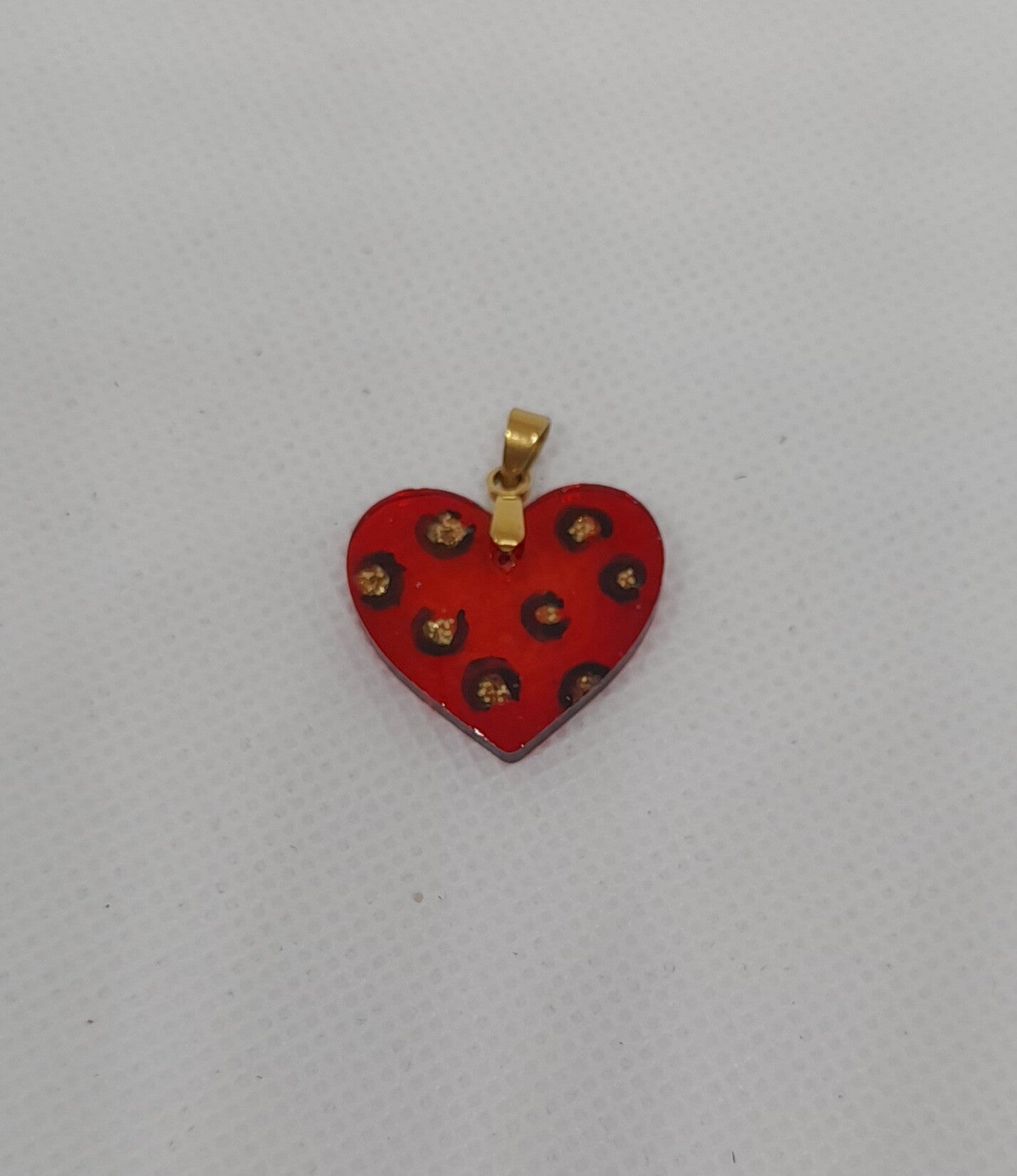 Deze mooie hartvormige kettinghanger is handgemaakt van epoxyhars. De hanger heeft een heldere rode kleur met een elegante luipaardprint in zwart en goudglitter.