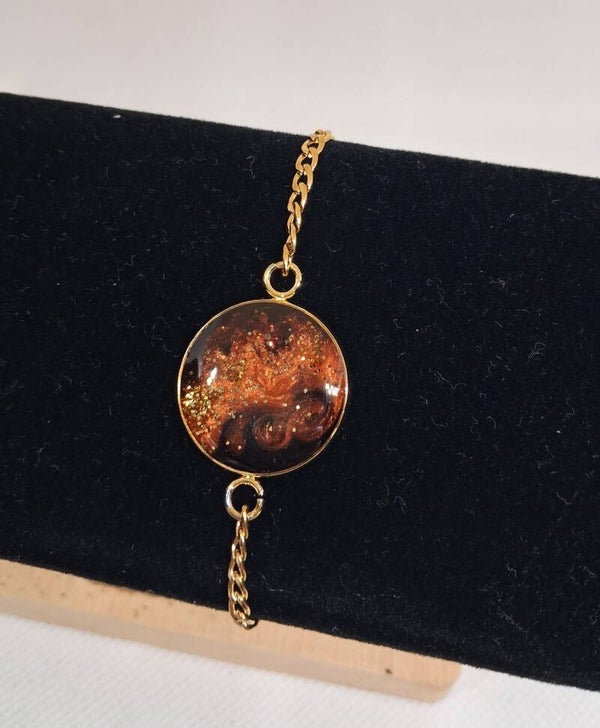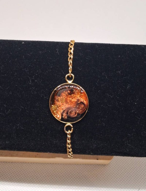 Deze handgemaakte armband heeft een rond tussenstuk van epoxy met warme bruin-, koper- en goudtinten en een subtiel glinsterend effect.