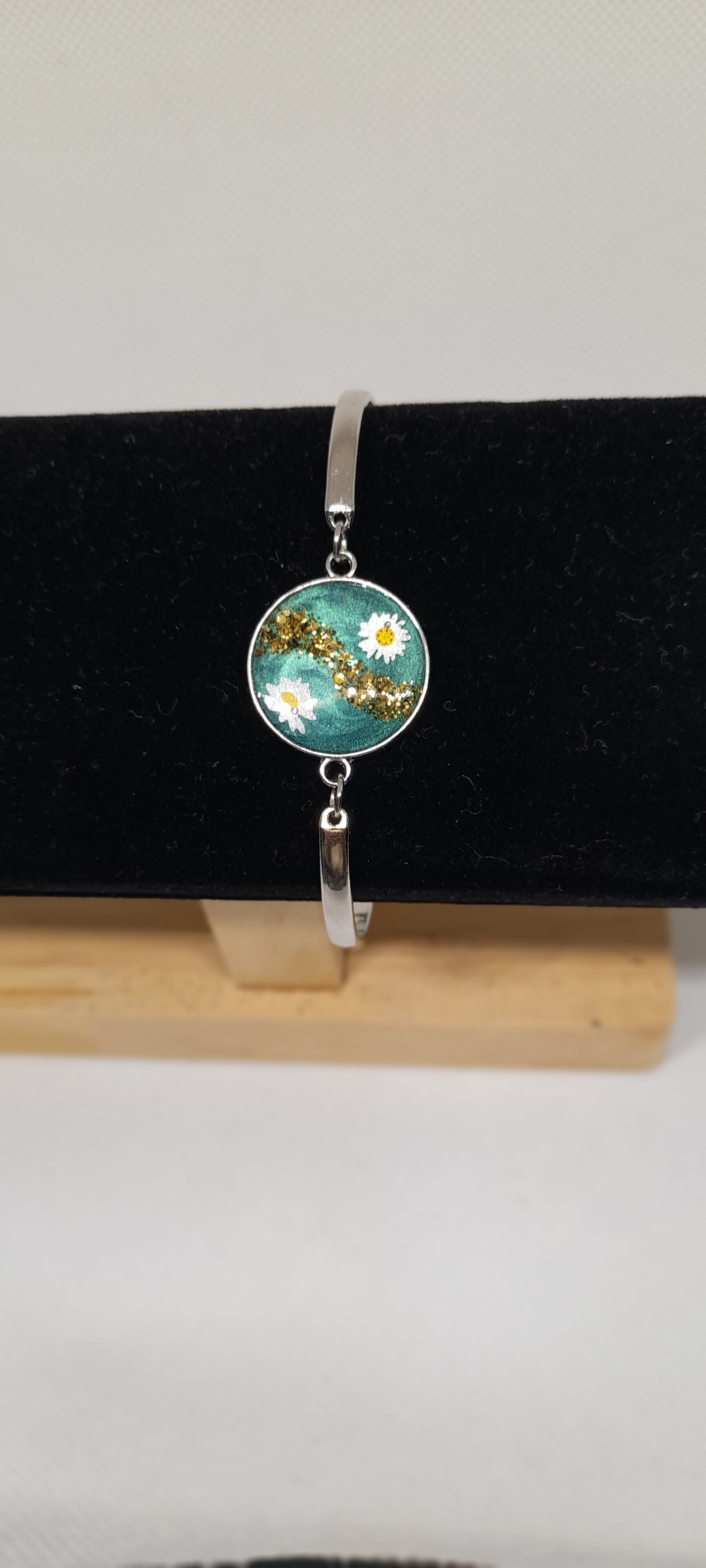 Deze armband vab epoxy en messing heeft de prachtige kleur smaragdgroen met een golf van goudglitter en een bloem aan beide kanten ervan.