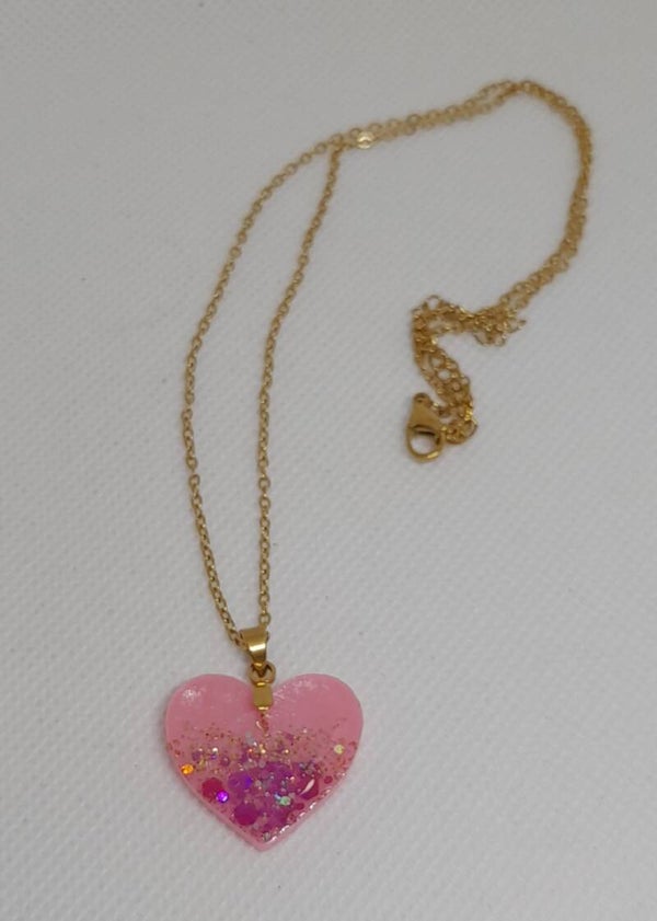 Deze handgemaakte ketting is heeft een zachtroze hanger in de vorm van een hart en is vervaardigd uit hoogwaardige epoxy, verrijkt met fonkelende glitters in roze en goud tinten.