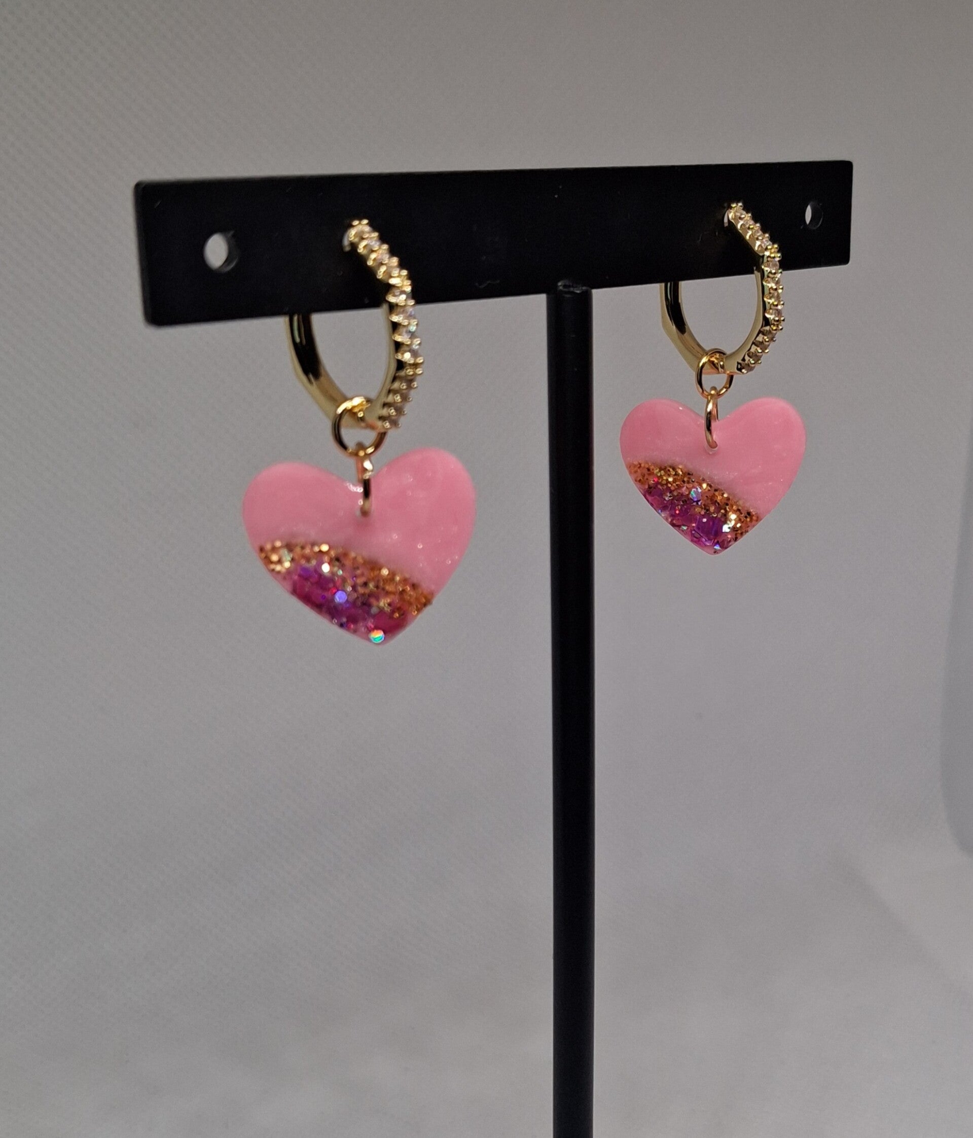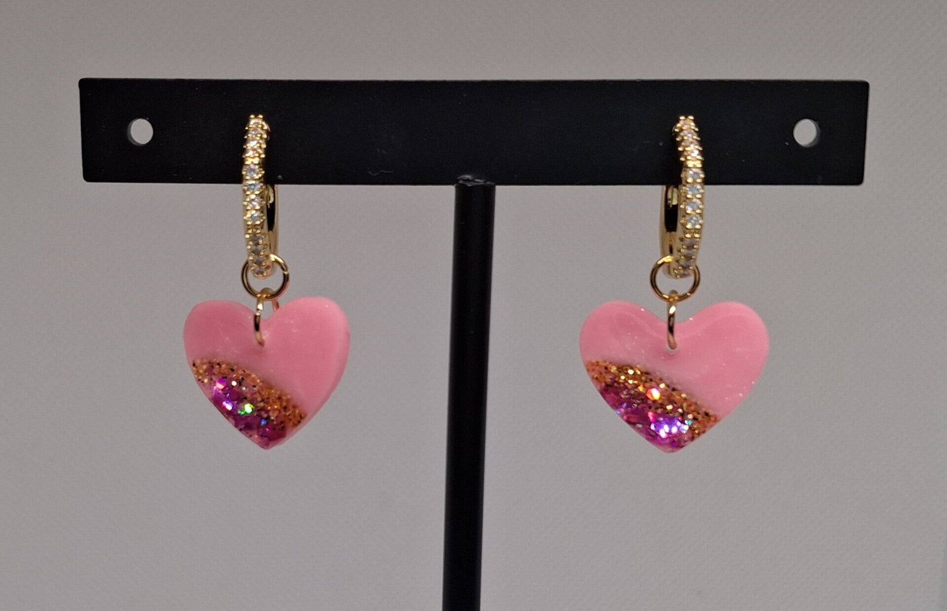 Deze stijlvolle acht hoekige creolen met steentjes hebben een hartvormige zacht roze hanger met roze en goud glitter.