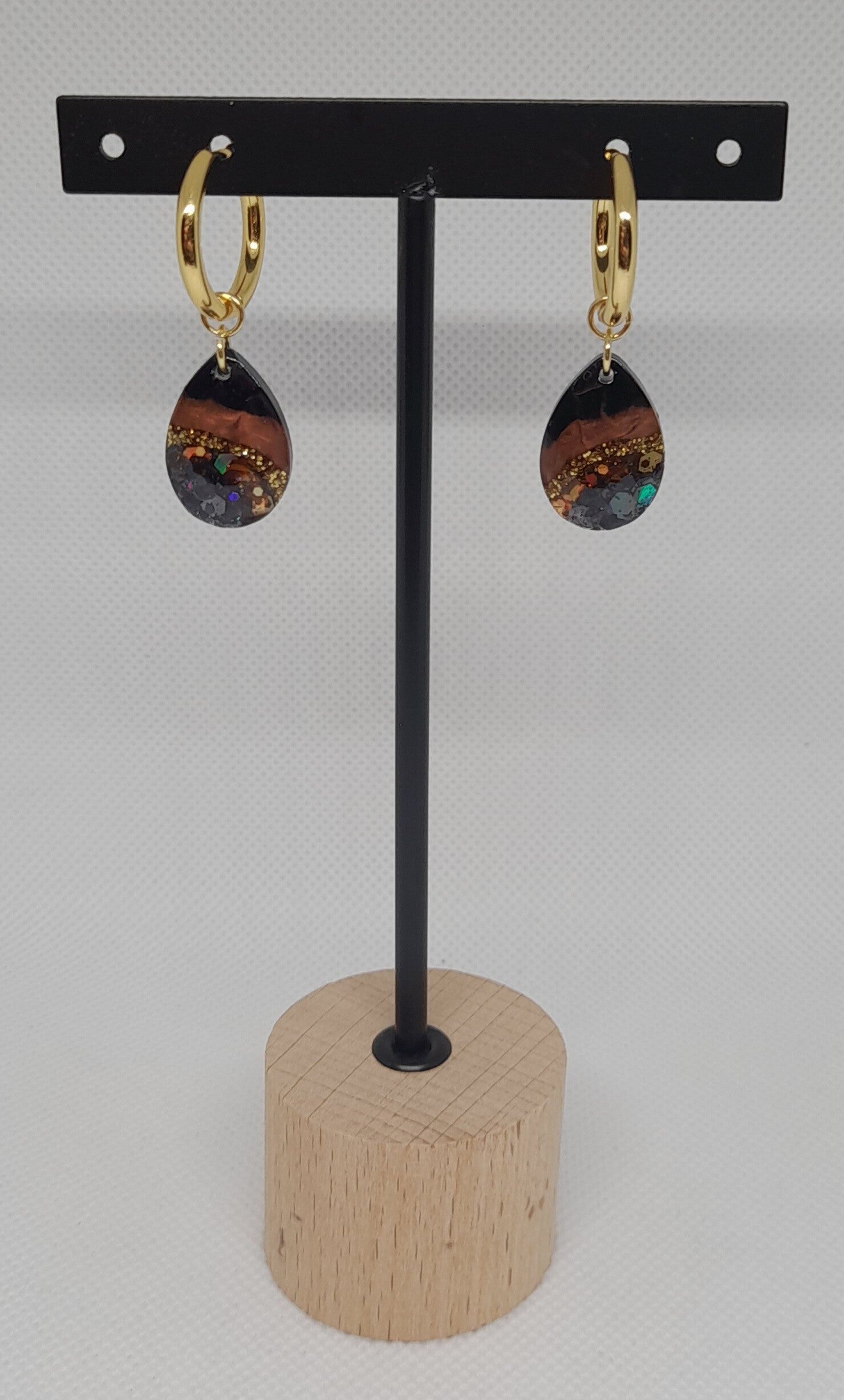 Bij deze goudkleurige creolen kun je kiezen welke hangers jij het leukst vindt of als je niet kunt kiezen, ga je voor alle drie! Er is keuze uit rechthoekvorm in blauw, turqoise en goudglitter. Of de ovaal met bruin, glitter en een zonnebloem. Ten slotte is er nog de druppelvorm in zwart, koperbruin, goudglitter en zwartglitter.