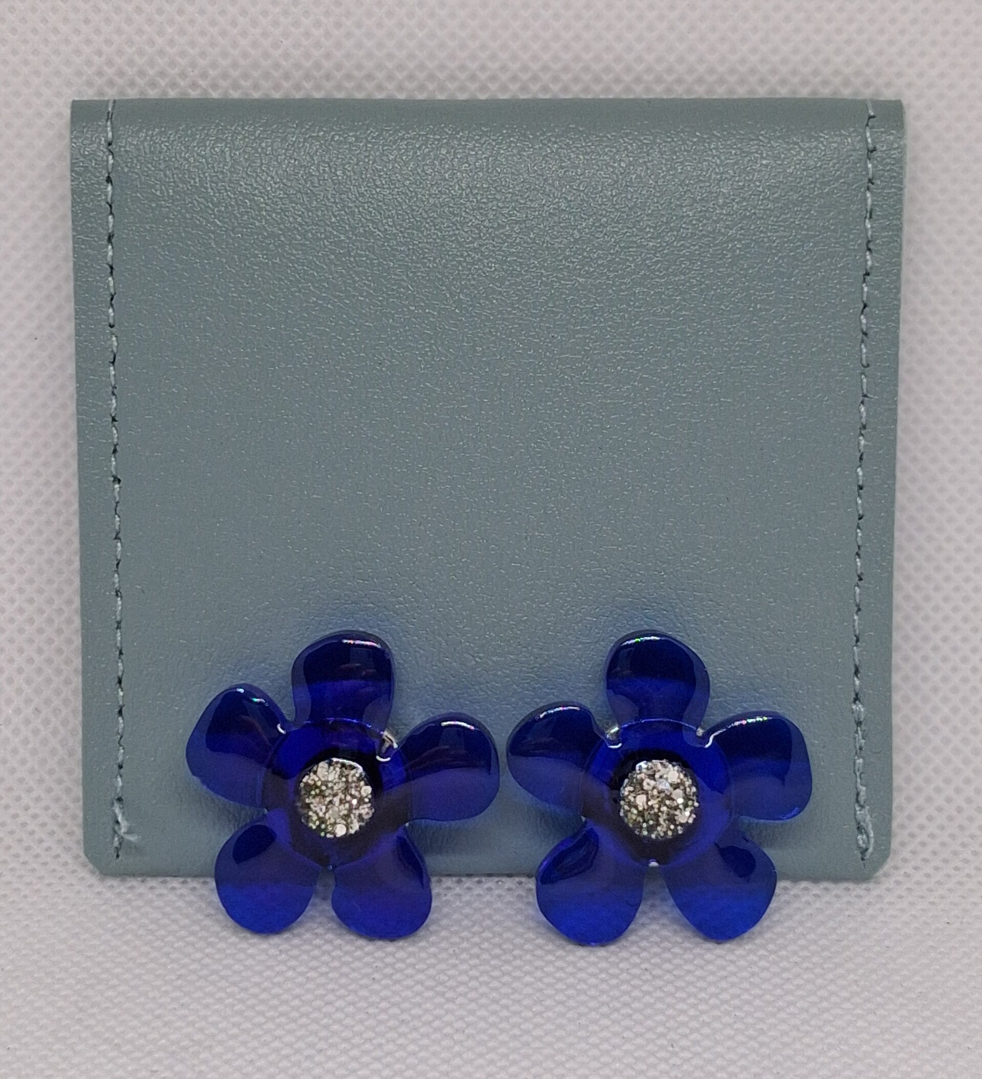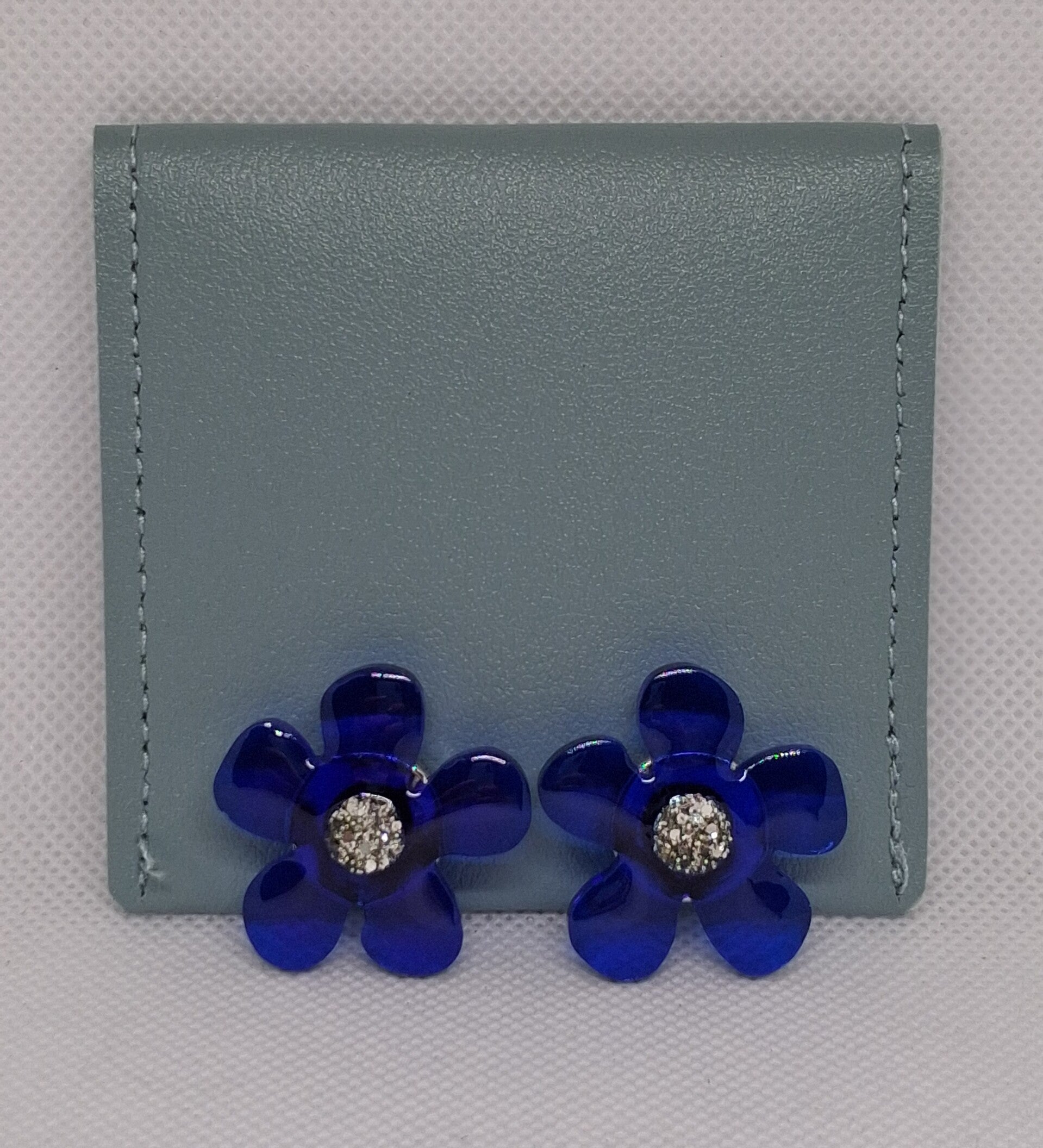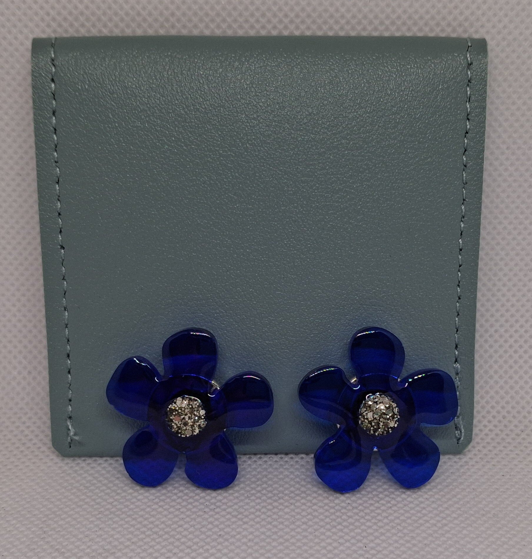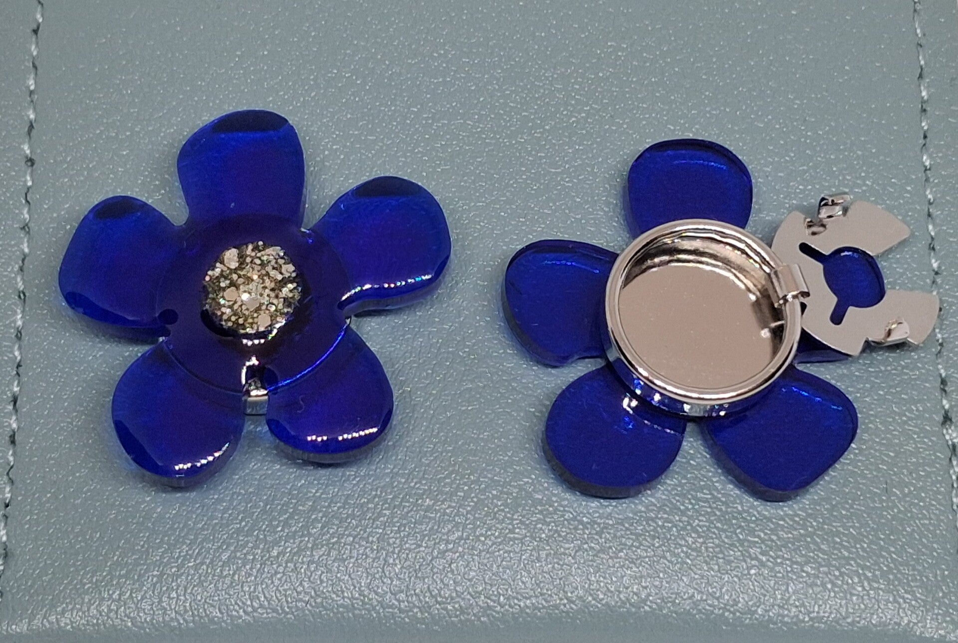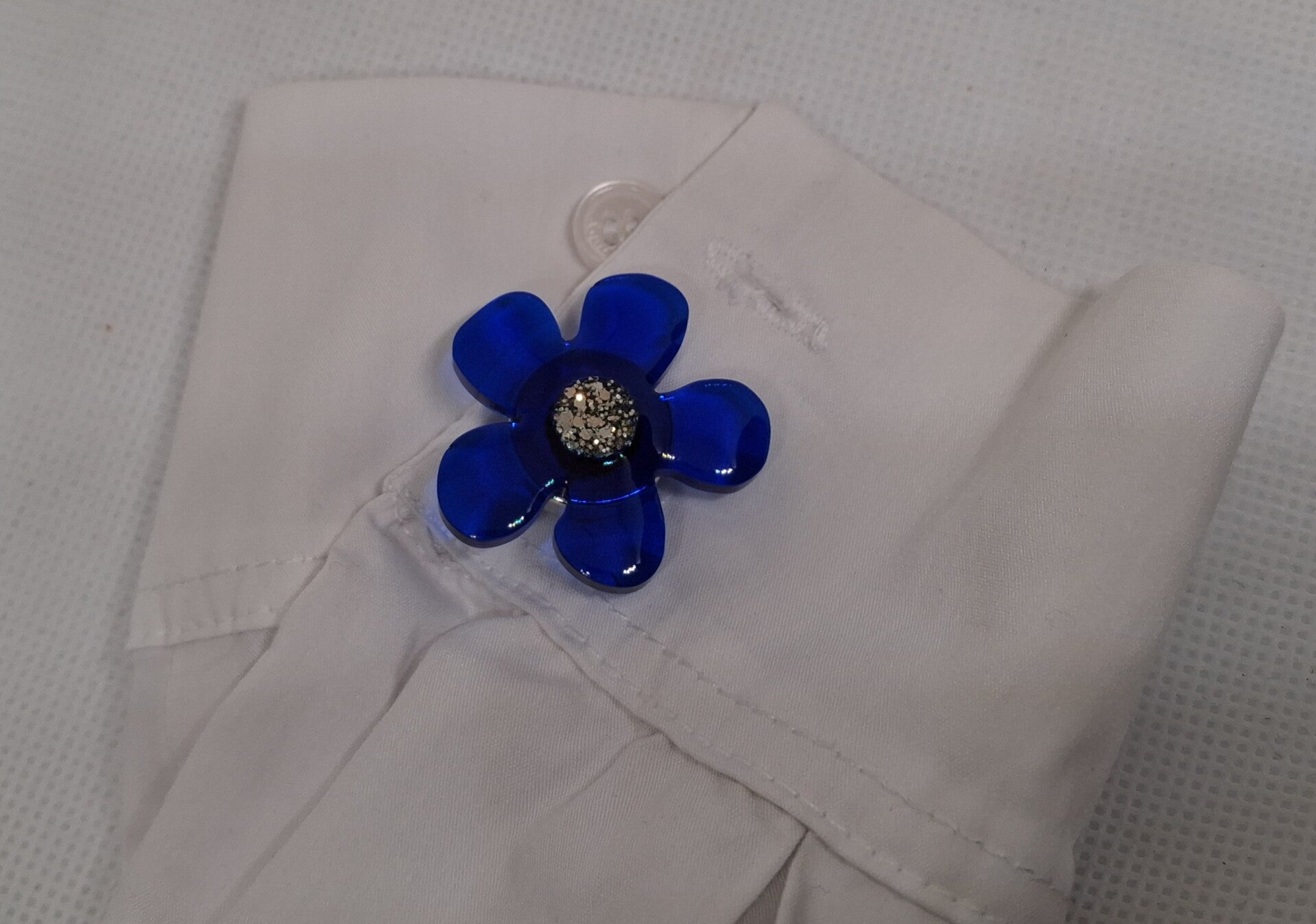 Deze opvallende buttoncovers in bloemvorm geven je outfit een speelse en stijlvolle uitstraling. Ze zijn gemaakt van hoogwaardig epoxy in een diepe, transparante kobaltblauwe tint. Het hart van de bloem is afgewerkt met een subtiel glinsterend detail, wat zorgt voor een verfijnde en luxe touch.