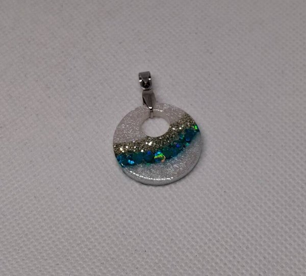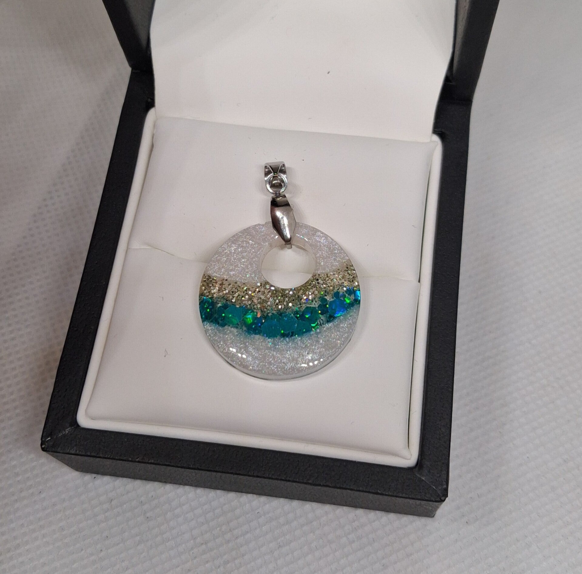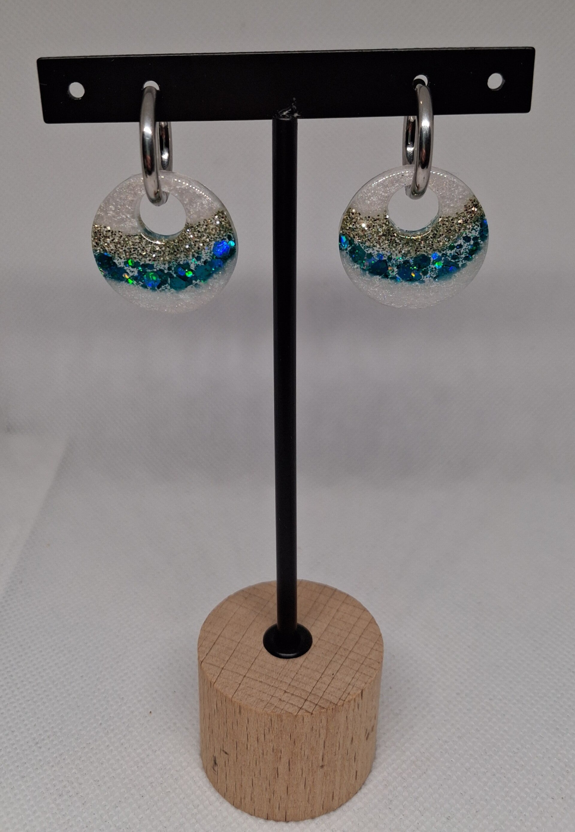 Handgegoten epoxy in wit parelmoer met glitters in zilver en turquoise
