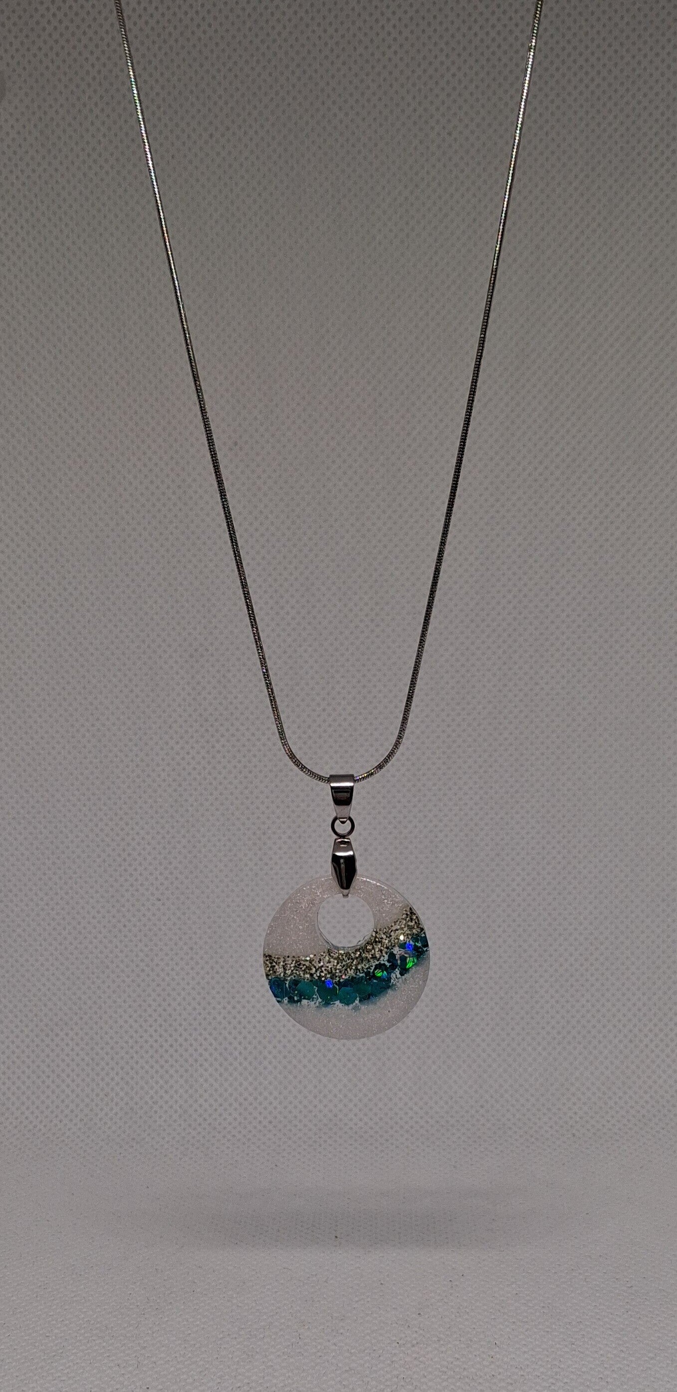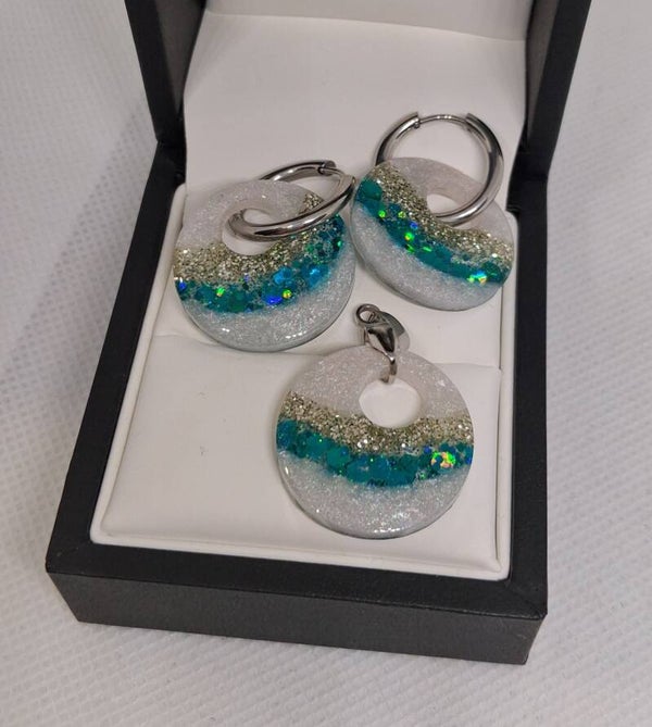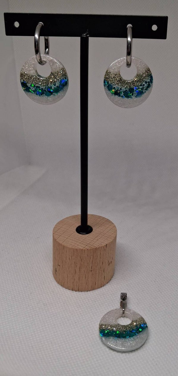 Breng een vleugje sprankelende elegantie in je look met deze handgemaakte sieradenset van roestvrijstaal en epoxy. De set bestaat uit een paar stijlvolle oorringen en een bijpassende hanger, uitgevoerd in een rond design met een speelse uitsparing.