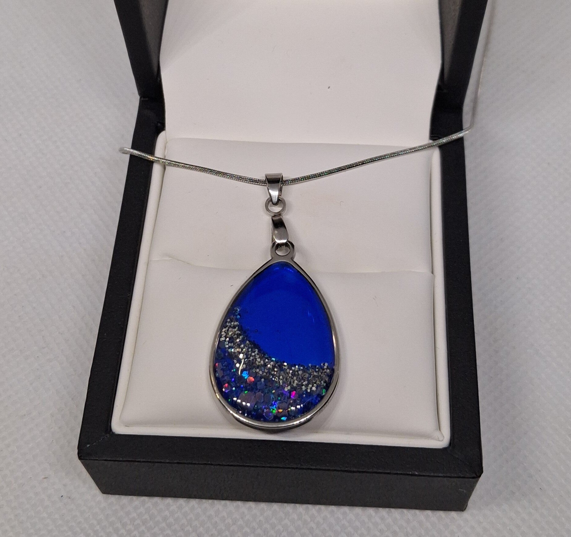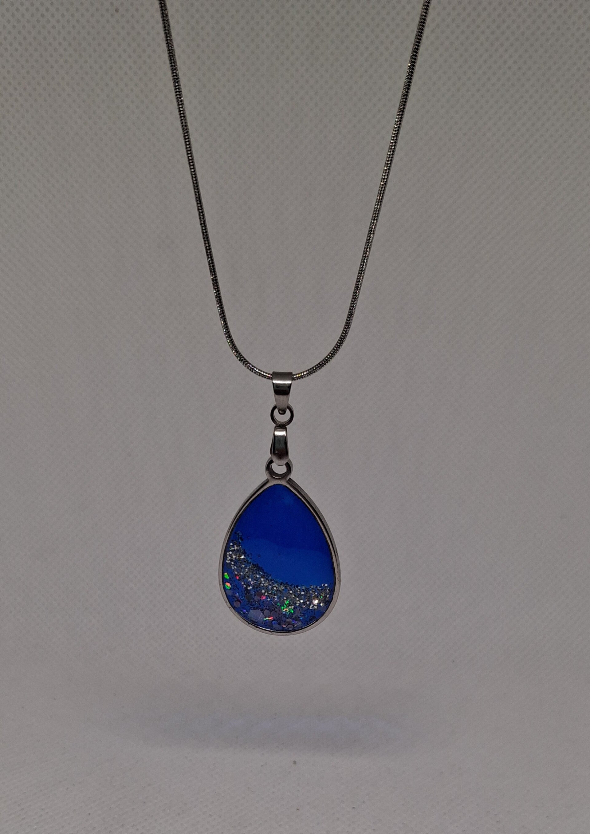 Geef je outfit een opvallende en elegante touch met deze prachtige ketting. De druppelvormige hanger combineert een intens diepblauwe epoxybasis met een speelse, glinsterende afwerking aan de onderzijde. De subtiele sparkle vangt het licht op een unieke manier, waardoor de hanger bij elke beweging tot leven komt.