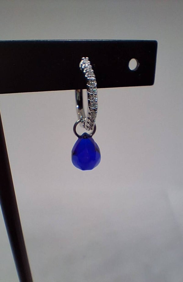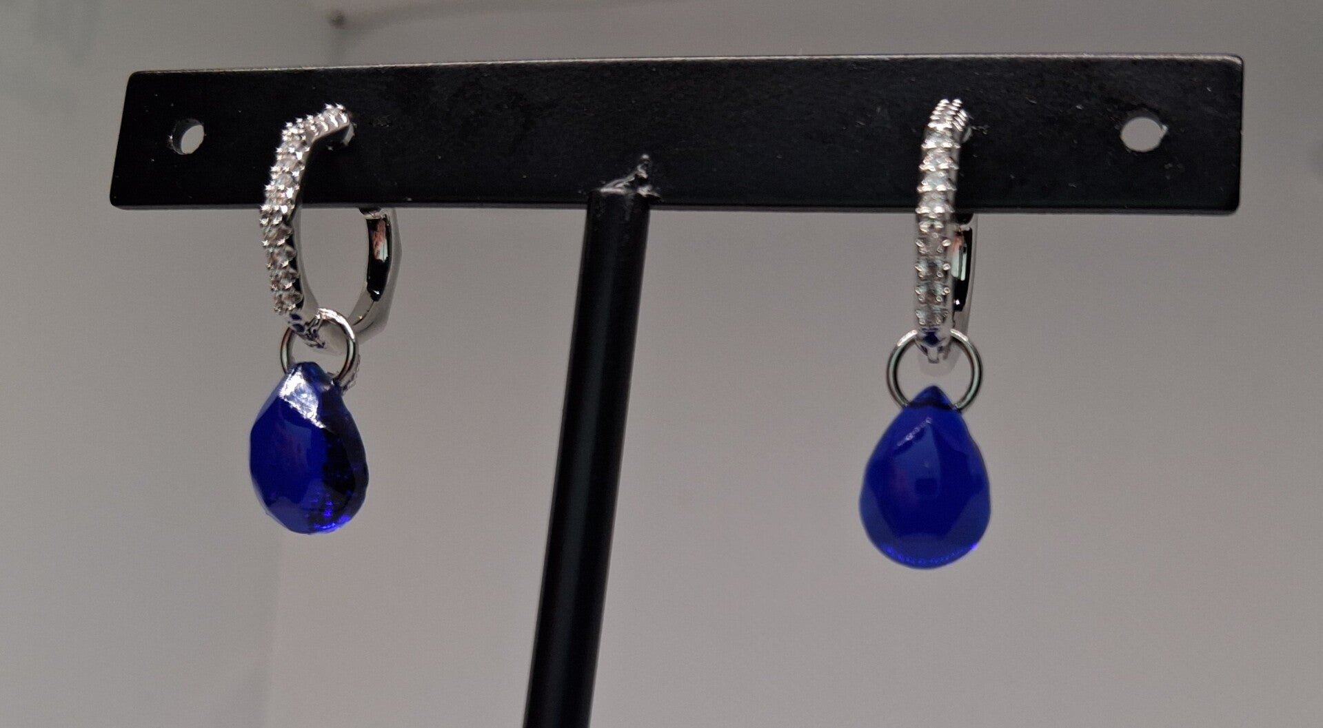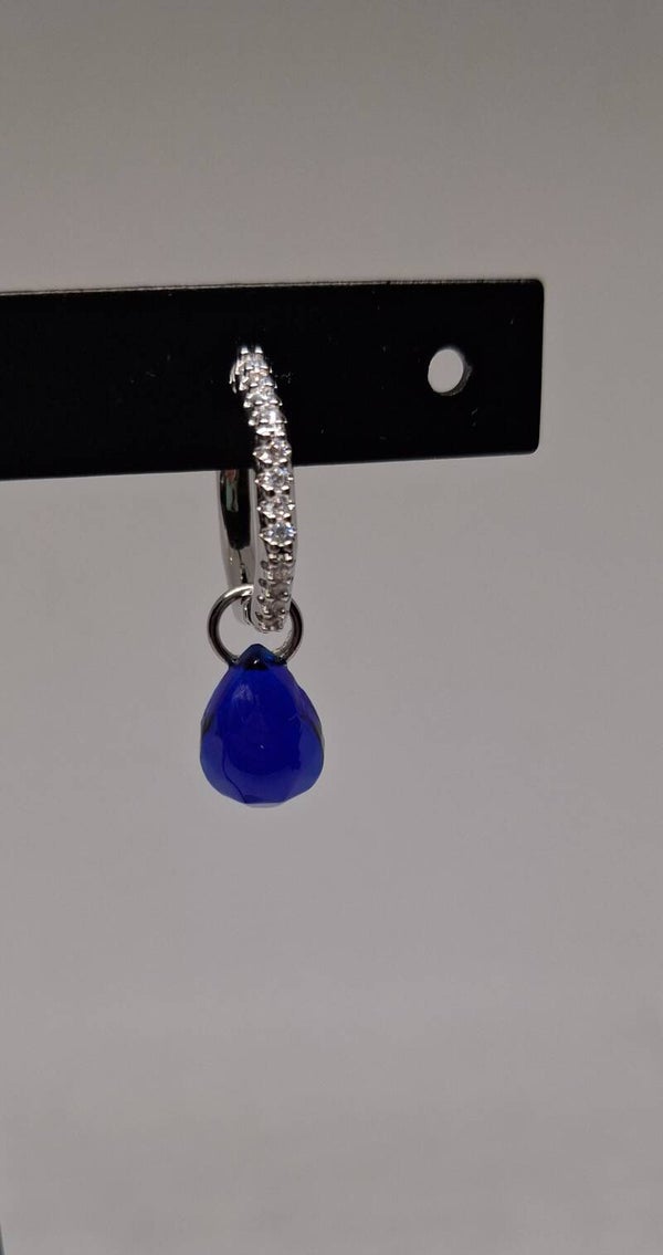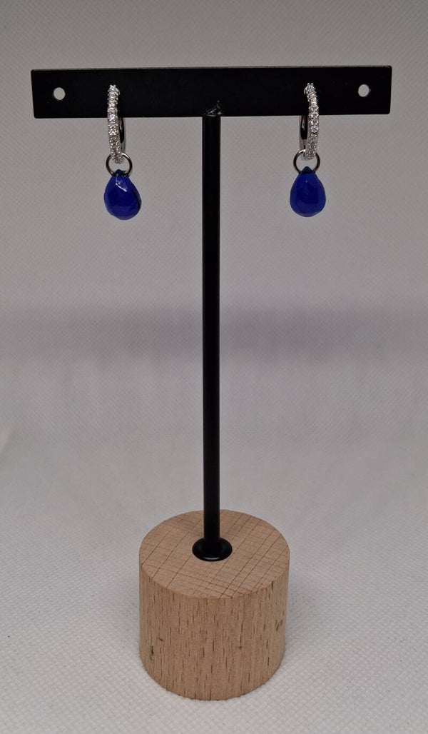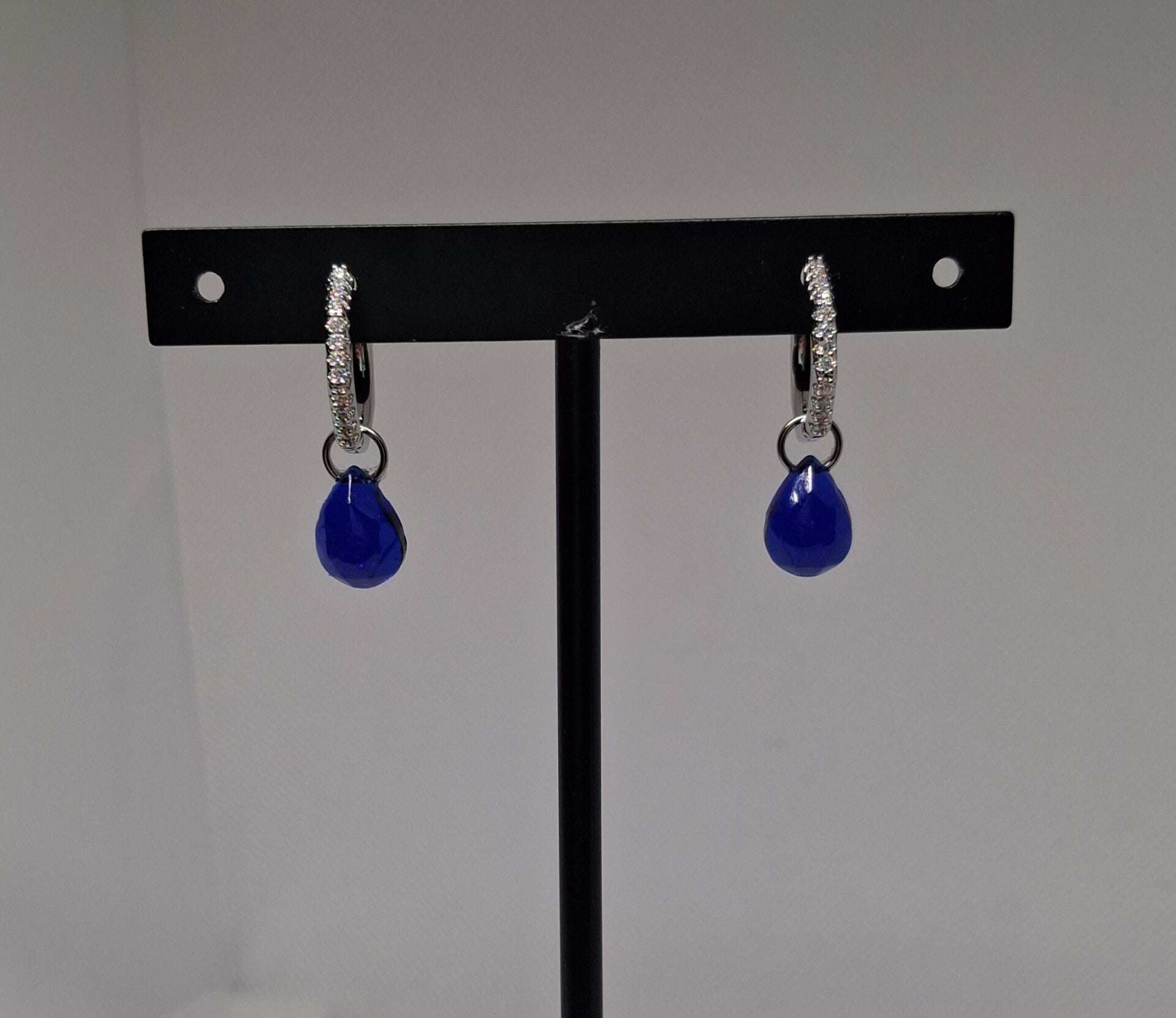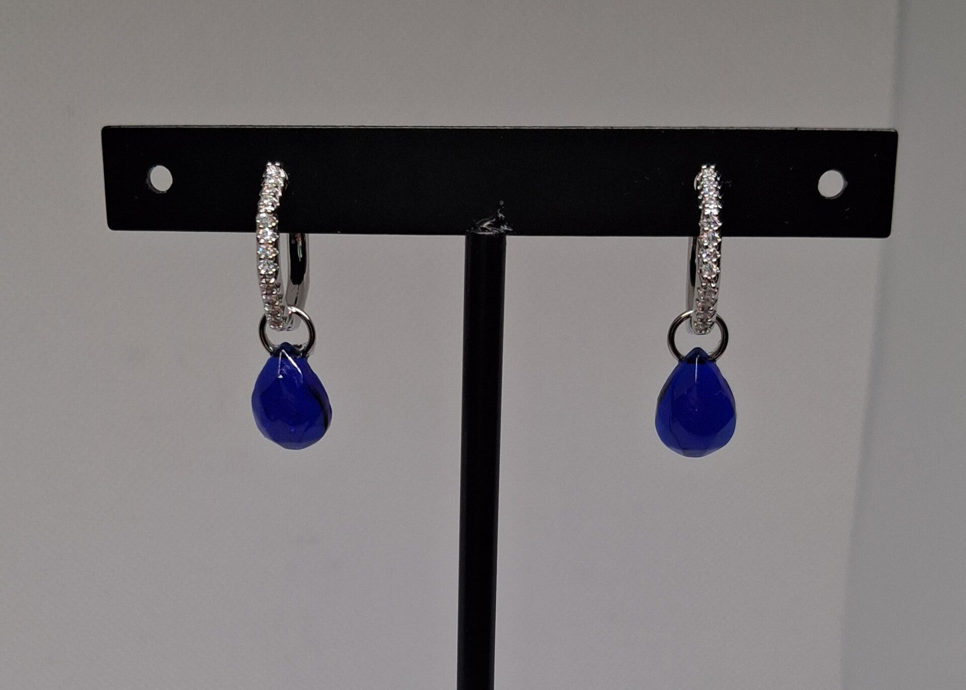 Deze verfijnde oorbellen combineren een moderne look met een speelse touch. De subtiele creolen van roestvrij staal zijn afgewerkt met een rijtje fonkelende steentjes, waaraan een diepblauwe epoxy hanger in druppelvorm hangt. Dit zorgt voor een stijlvolle en opvallende uitstraling.