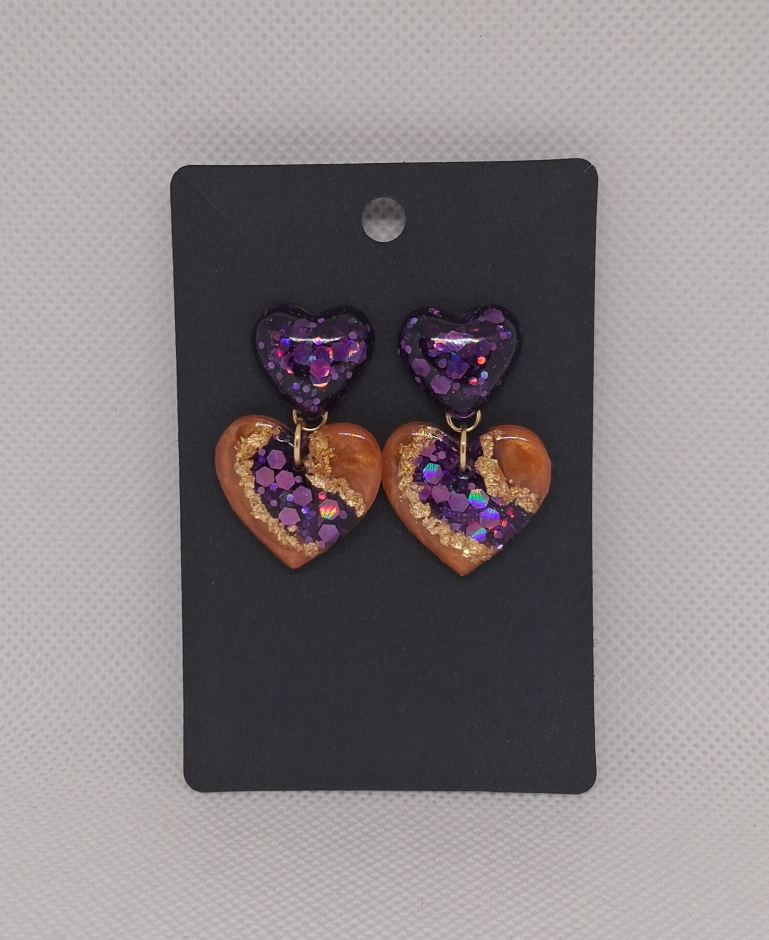 Deze vrolijke oorbellen zijn met de hand gemaakt van epoxy en hebben roestvrijstalen onderdelen. Ze bestaan uit twee hartjes met een mooie mix van paarse glitter, oranje en goudkleurige details.